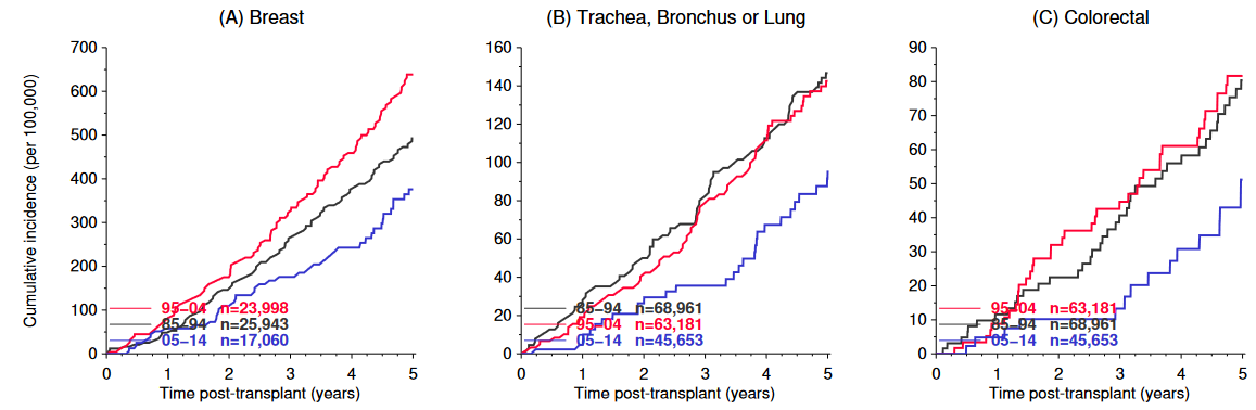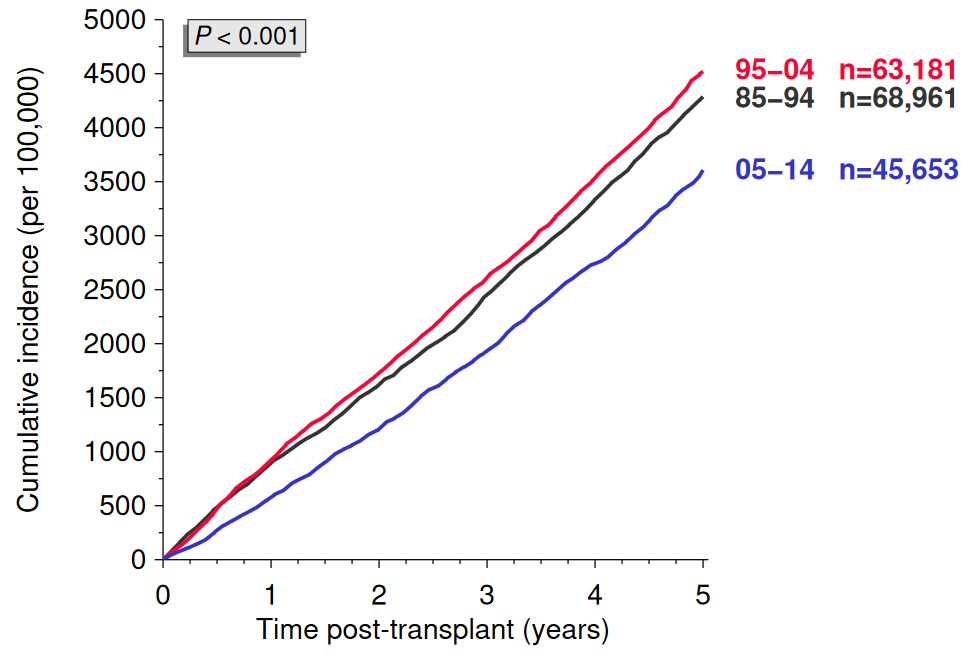 Methods: We analyzed data of 177,795 patients with 19,909 primary cancers from 309 transplant centers reported to the Collaborative Transplant Study. 14- to 49-year-old recipients of first kidney-only transplants performed between 1985 and 2014 were included. Only centers that confirmed complete cancer reporting were included in the analysis. 5-year cancer occurrence was the primary endpoint. Cumulative incidence per 100.000 person-years stratified by transplant period was calculated using SAS 9.4. Recipients were stratified by time of transplantation into three decades: 1984–1994, 1995–2004 and 2005–2014.