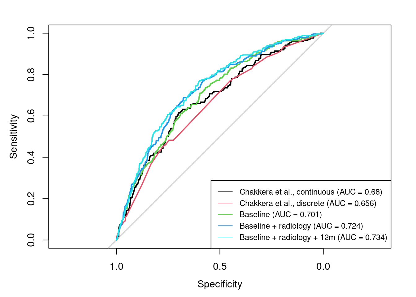 Radiological risk factors of significance on univariate analysis included skeletal muscle area, subcutaneous and visceral adipose tissue area, and intermuscular adipose tissue area. Multivariate analysis revealed that increasing age, nonwhite race, family history of Diabetes, and visceral adipose tissue area were significant predictors. The model using variables such as recipient age, family history of diabetes, race, and visceral adipose tissue area achieved the highest Area Under the Curve (AUC) of 0.7227 for NODAT prediction. Comparison between existing models and different models from this study are shown in figure 2.