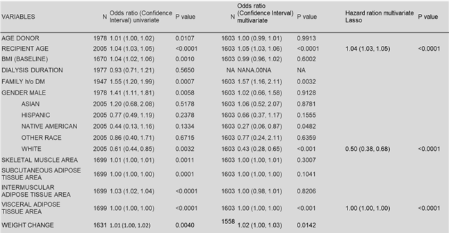 Results: The study involved 2,005 kidney transplant recipients, with 335 (16.7%) developing NODAT in the first year. The mean age was 52.5 (14.2) years, the mean BMI was 27.4 (6.74) kg/m², and 56.9% were male. Univariate analysis identified risk factors including older age, male gender, baseline BMI, nonwhite race, steroid use, and a family history of Diabetes (Figure 1).