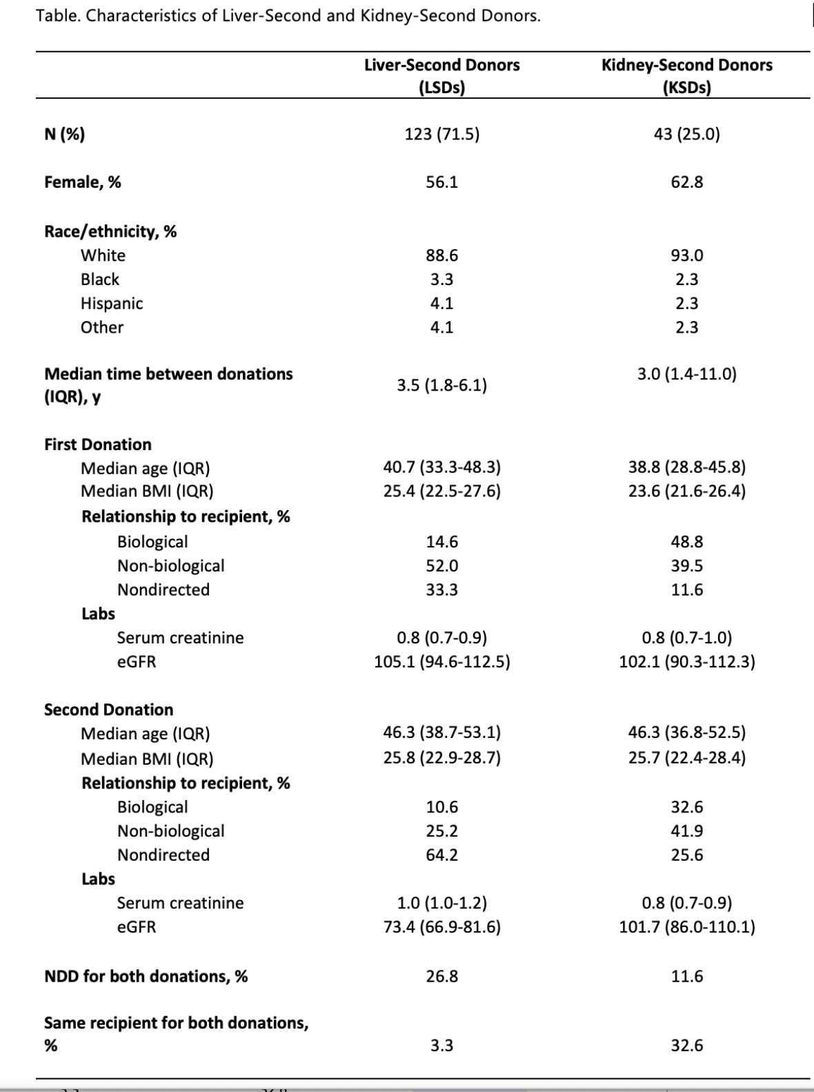 Methods: We used SRTR data 1994-2022 to identify 172 repeat living donors and their 320 recipients. We constructed a comparator group of first-time donors (FTDs) using weighting by the odds. We described clinical and lab results at 6 months, 1 year and 2 years post-donation. We conducted this methodology separately for kidney-second donors (KSDs) and liver-second donors (LSDs). Inference was consistent after regressing on sex, BMI, race and age in a doubly robust model.