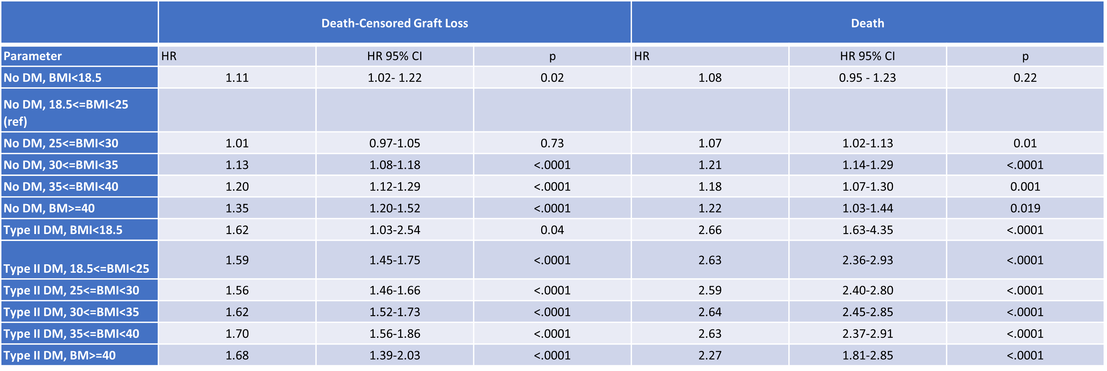 Conclusions: In this contemporary cohort of LDKT, in non T2DM recipients, incremental increase in obesity was associated with incremental increased risk of graft loss and death. However, T2DM recipients graft loss and death were increased irrespective of BMI . Further studies are necessary to understand the specific risk factors conferred by T2DM and elucidate the value of pre- and post-transplant interventions.