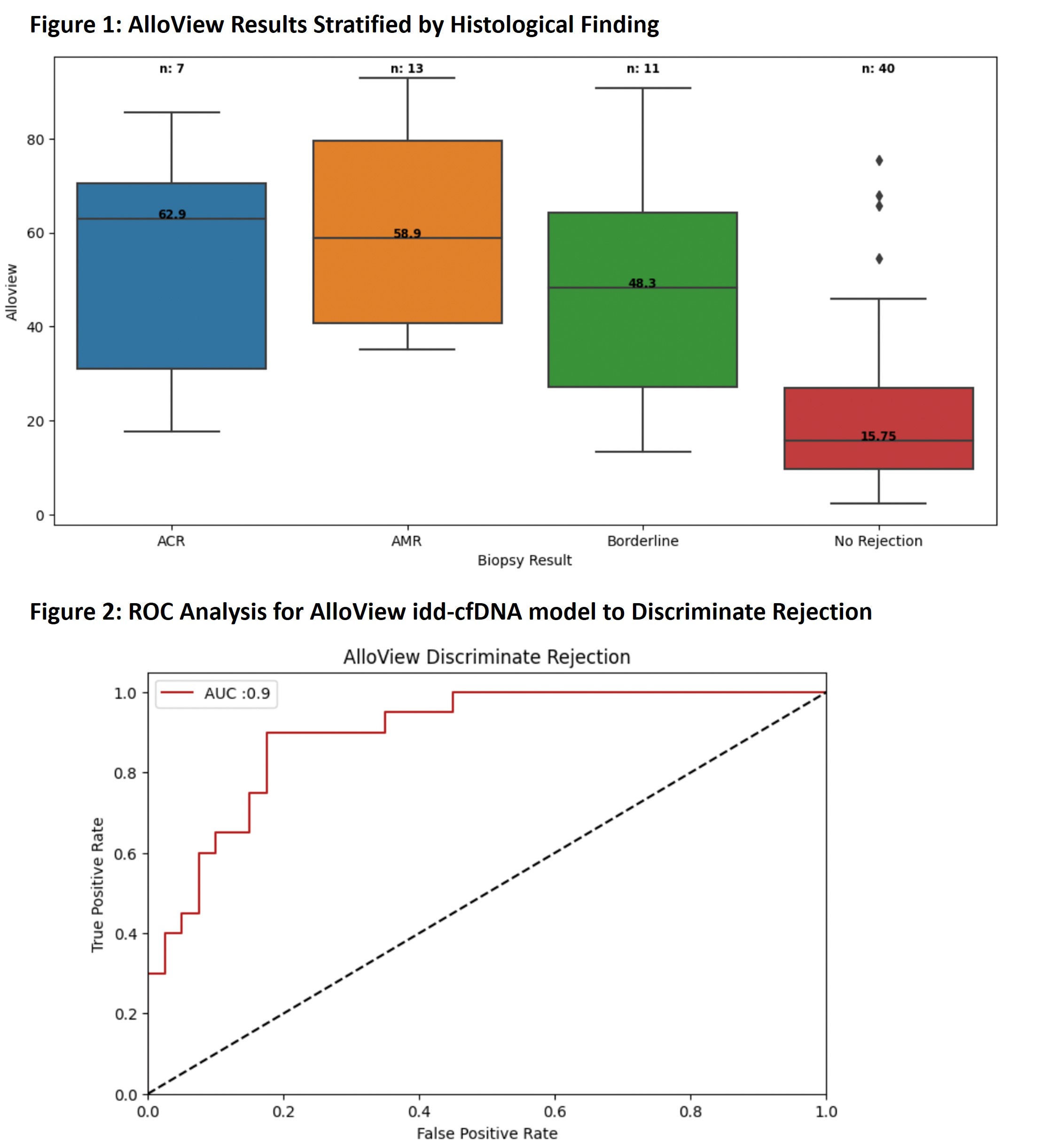 Conclusion: Our data highlights for the first time the median AlloView values in rejection versus no rejection. The significant differences seen highlight the utility of AlloView in discriminating patient individual risk of rejection. With further validation, these references may support interpretation of the model.