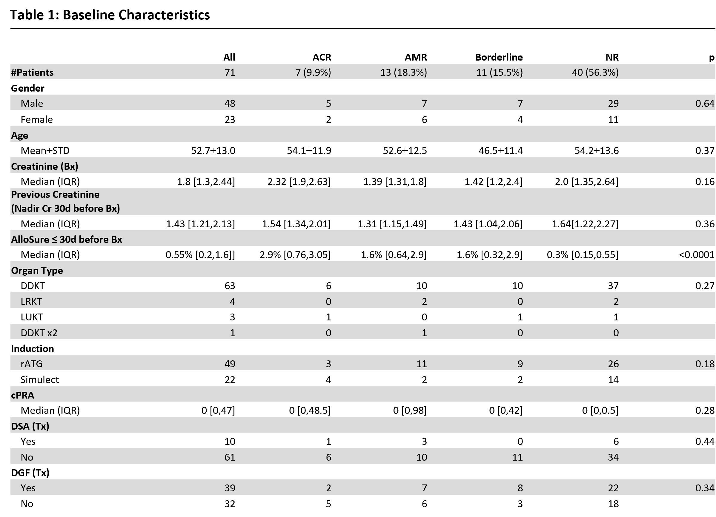 Method: KTR from 1/1/2017 to 12/31/2023 with at least one biopsy, dd-cfDNA result ≤30 days preceding biopsy, and all AlloView clinical SOC input variables were included. Patients with BK virus nephropathy (BKVAN) or pyelonephritis were excluded. Primary analysis compared median AlloView results stratified by histological diagnosis: acute cellular rejection (ACR), acute antibody-mediated rejection or mixed rejection (AMR), borderline rejection, and no rejection. No rejection cohort also included acute tubular injury/necrosis, glomerulopathy (i.e., glomerular disease, such as FSGS, membranous nephropathy) and calcineurin inhibitor toxicity. Nonparametric tests were used to assess categorical and numerical variables. The area under the receiver-operating characteristic curve (AUROC) was used to determine the discriminating accuracy of AlloView.