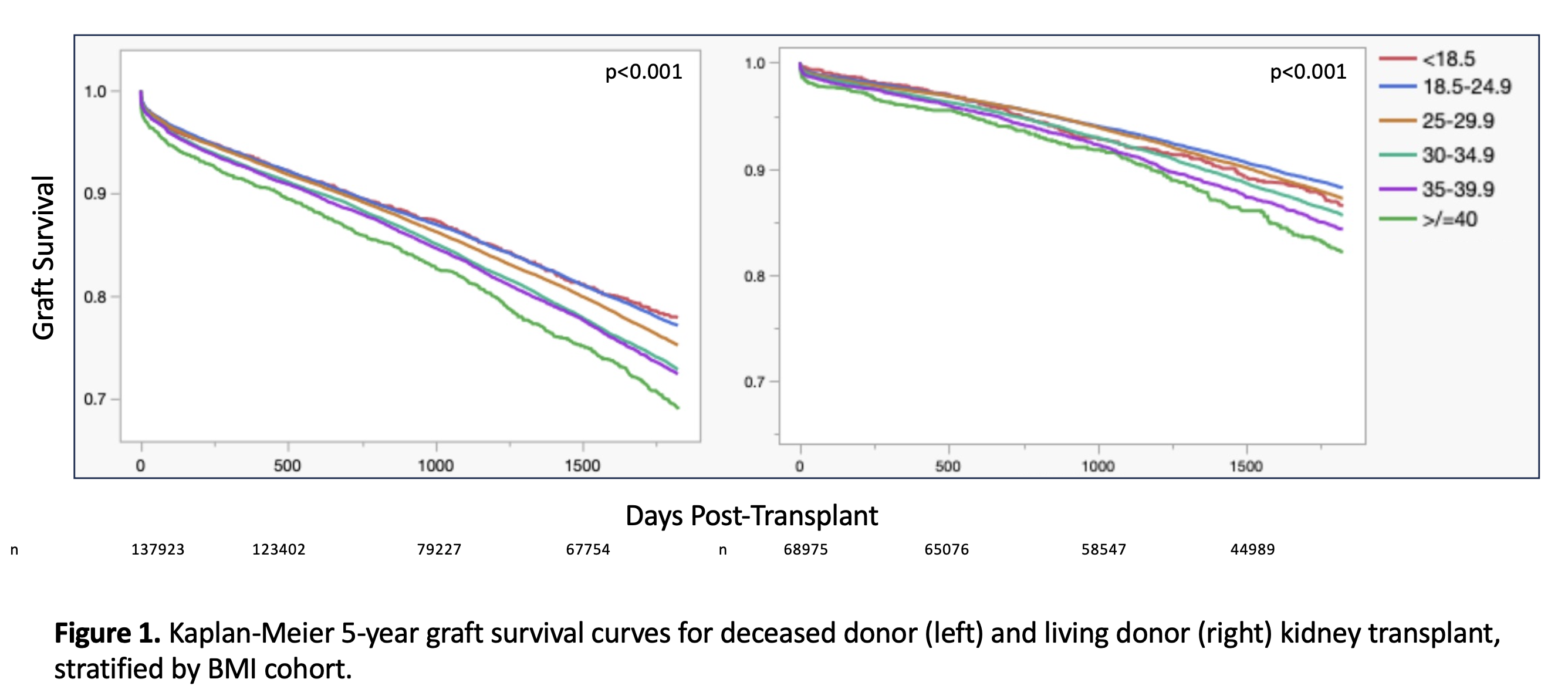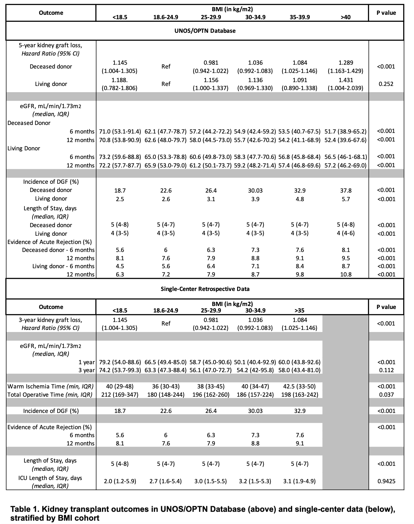 Methods: A retrospective analysis of the UNOS/OPTN database identified all KT recipients from 2005-2019. Transplant recipients were analyzed by donor type: deceased donor (n=138,132) versus living donor (n=68,957). Donor and recipient demographics were used to construct a multivariable regression model stratifying recipients into cohorts by BMI (<18.5kg/m2, 18.6-24.9kg/m2, 25-29.9kg/m2, 30-34.9kg/m2, 35-39.9kg/m2, ≥40kg/m2), with 70% of patients were included in the test cohort and 30% in the validation cohort. The primary outcome was 5-year graft survival, with secondary endpoints incidence of delayed graft function, post-transplant glomerular filtration rate (eGFR; CKD-EPI Creatinine Equation (2021)), and acute rejection episodes. Additionally, we evaluated all KT performed at our center during a 3-year period (2018-2021; n=806) to evaluate additional outcomes not available in the UNOS/OPTN database.