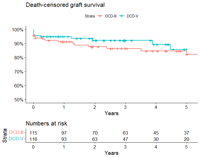 Results: A total of 142 ODE kidneys were transplanted and compared to 2144 DCD kidney transplants. ODE was increasingly performed over the past years. Time from withdrawal of life support/administration of euthanasic drugs until cardiac arrest was significantly shorter in the ODE group compared to the DCD group (14.5 ± 5.7 versus 24 ± 19 min p<0.001). Delayed graft function (DGF) occurred significantly less in the ODE group compared to the DCD group (23.2% versus 51.4%, p<0.001). Serum creatinine in the ODE group was lower at 1-, and 3 years post-transplantation, although this did not reach statistical significance. Five year death-censored graft survival was 86% in the ODE-group, compared with 82% in the DCD group (p=0.32, Figure) and five-year patient survival was 71% in both groups (p=0.39).