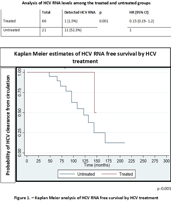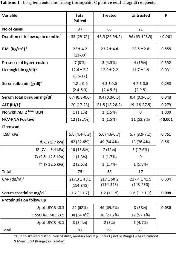 Results : Among the 2883 renal transplants done from 1994 to 2019, a total of 364 patients had HCV infection. Of these, 208 patients were included in the study, as 64 patients died, 60 had graft loss and 32 were either loss to follow up or co infected with Hep B or HIV. As this study was conducted during the covid pandemic, therefore only 87 patients were able to complete the investigations as per the study protocol. Among them, 66 patients were treated, 56 with DAA and 10 with IFN based regimen. The mean age of the patients was 32.54 ± 9.13 years and 85% were males. The median follow up was 55 (29-75) months. Till the last follow up, 11 out of 21 (52.3%) among the untreated group had significant viral load whereas only one of the treated with IFN based regimen, had viremia. The median serum creatinine was 1.2 (1-1.5) mg/dl among the treated group vs 1.6 (1.2-1.9) mg/dl among the untreated group, (p - 0.008). The median serum alanine aminotransferase (ALT) levels were comparable in both the groups, treated -21.5 IU/L (18-28.2) vs 19 IU/L (16-27.5) untreated group. A total of 75 patients had fibroscan, among them 2 untreated patients had advanced liver scarring (cirrhosis) with the LSM score - 15 ± 1.2kPa(f4) and 10 ± 1.9 kPa(f3) in them, while only one patient in the treated group had evidence of severe liver scarring with LSM score - 20.7± 3.4 kPa (f4).