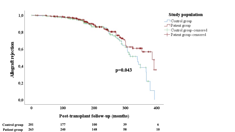 Based on Kaplan-Meier analysis, the patient group exhibited markedly lower allograft rejection rates than the control group (52 in the patient group, 60 in the control group, p = 0.043).