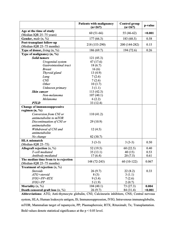 Results: Out of the 2,750 medical records reviewed, 267 kidney transplant recipients (9.7%) were found to have biopsy-confirmed malignancies. These patients had a median age of 60 years (IQR25-75, 51-66), with 177 of them being men (66.3%). The median post-transplant follow-up duration was 218 months (IQR25-75, 153-290).