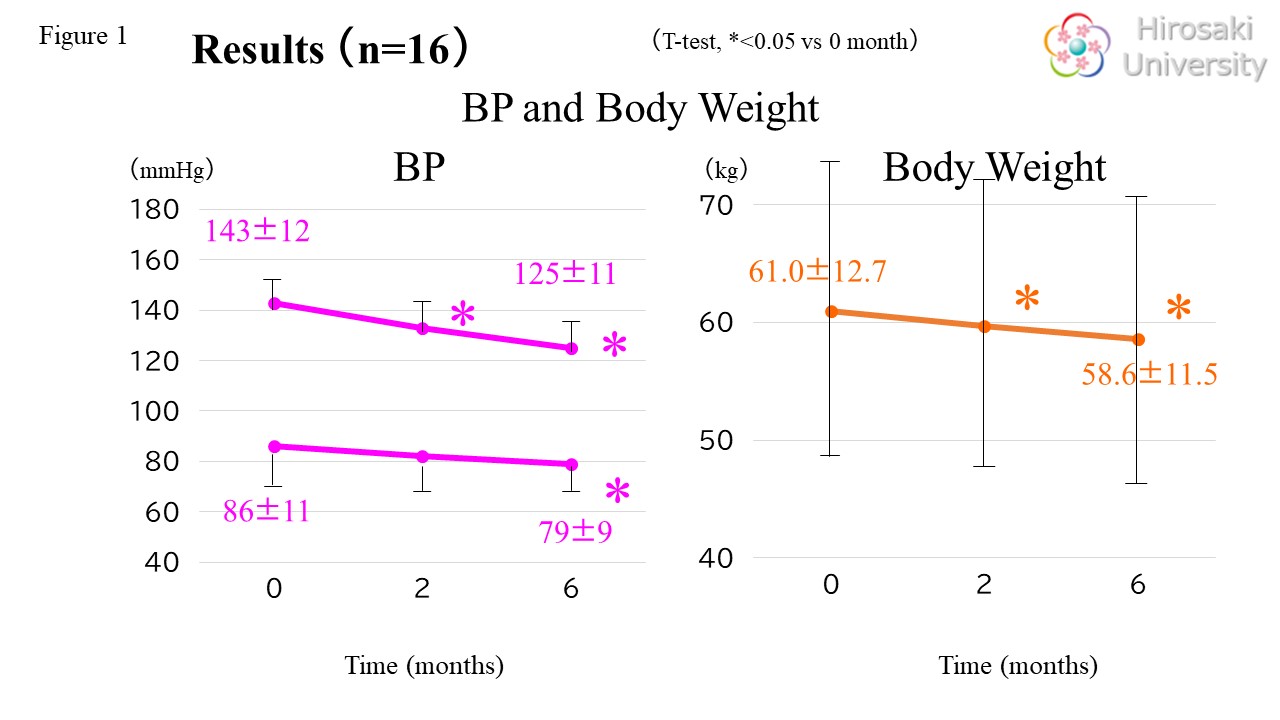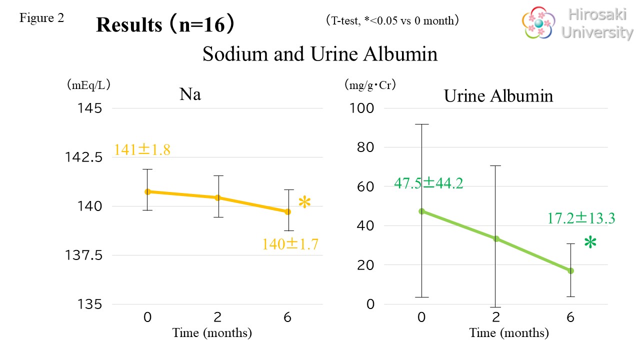Results: Blood pressure and body weight were significantly reduced in a time dependent manner after induction (Figure 1). Add Figure 1 Serum sodium levels decreased significantly also in a time dependent manner (Figure 2). Add Figure 2 Their renal function tests remain stable up to 6 months after induction of SAC/VAL. Although their hemoglobin A1c levels did not change, urine albumin levels were significantly decreased up to 6 months after induction of SAC/VAL (Figure 2).