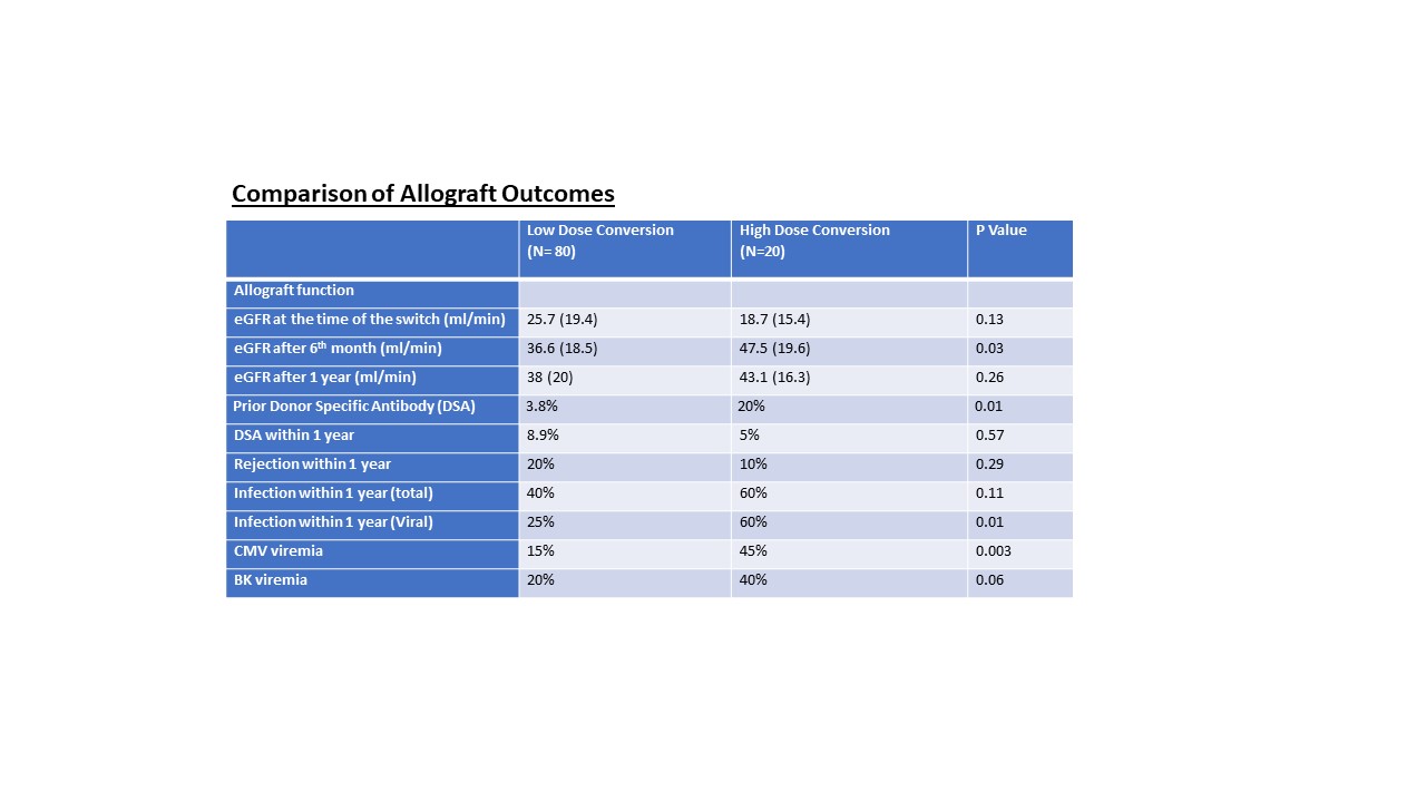 Results: 100 patients were converted to belatacept, 80 to low-dose, and 20 to high-dose protocol. No statistical differences were found between the groups except pre-formed donor-specific antibodies (DSA) higher in the high-dose group (Figure 1). The median days of belatacept initiation were 115.5 days (IQR 269.8) in the low-dose and 16.5 days (IQR 19.5) in the high-dose group (P=0.03). GFR significantly improved after six months and was steady at one year (Figure 2). There were more DSA in low-dose (8.9% vs. 5%) and more rejection episodes in low-dose (20% vs. 10%, P=0.29), mainly cellular rejection. Infection risk is statistically higher in the high-dose group (60% vs 25%), especially for viral infections, including CMV, BK, COVID, and EBV (Figure 2). One patient from each group had EBV viremia, and two patients from each group had COVID-19 infection. One graft loss was found in the high-dose and 11 graft loss were found in the low-dose group within one year.