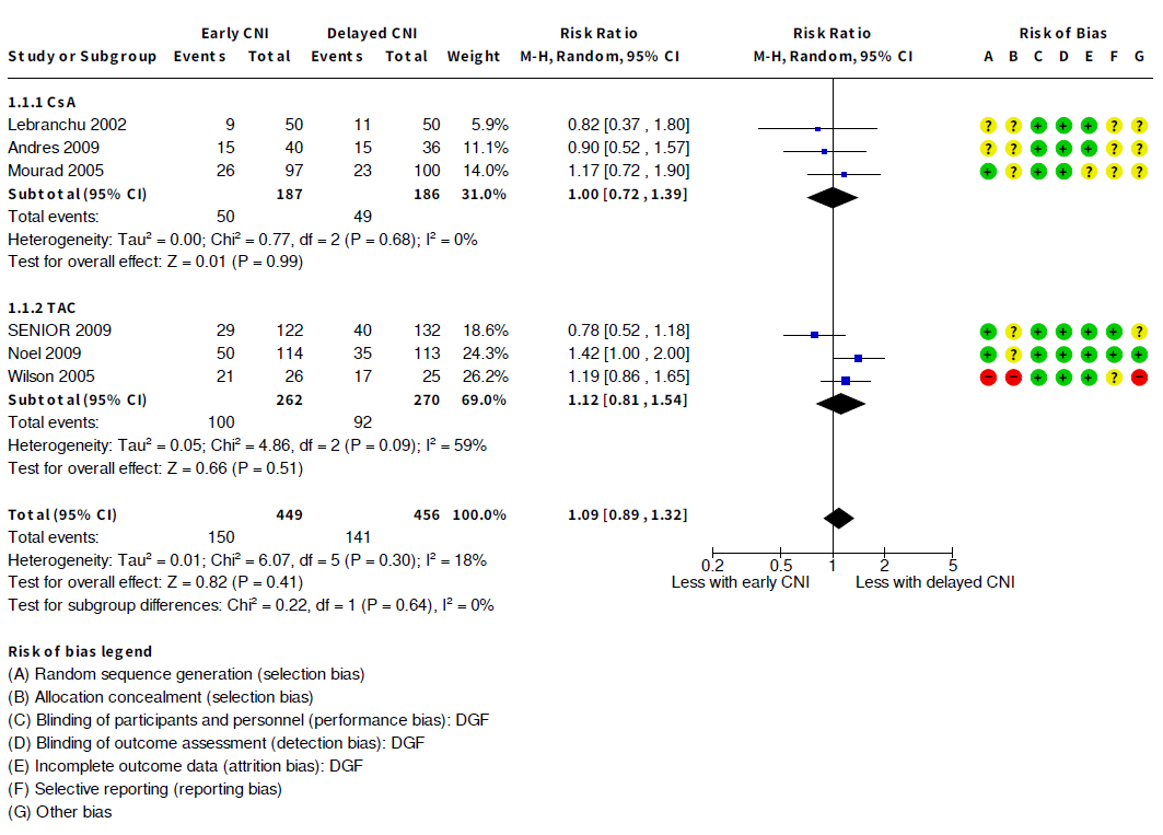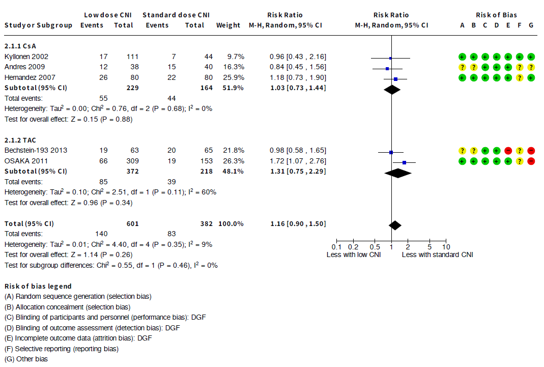 ) and acute rejection (RR 0.98, 95% CI 0.72 to 1.33; I2= 54%) were similar between early and delayed introduction of CNI, as well as between low vs standard dose of CNI (DGF: RR 1.16, 95% CI 0.90 to 1.50; I2= 9%; acute rejection: RR 0.70, 95% CI 0.43 to 1.14; I2= 58%). There were also no differences in secondary outcomes such as graft function, graft loss, risk of death, or infection.
