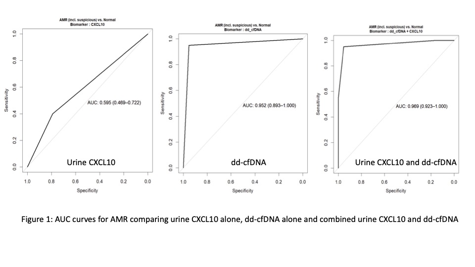 Results: The AUC for AMR (including suspicious AMR, compared to normal histology) was 0.952 (0.893-1000) using dd-cfDNA alone. In contrast, the AUC for urine CXCL10 alone for AMR was 0.595 (0.469-0.722) and increased to 0.969 (0.923-1.000) when combined with dd-cfDNA (p=1.71X10-8) (see Figure 1). When examining high grade TCMR, AUC for dd-cfDNA alone was 0.762 (0.562-0.963). In contrast, AUC for urine CXCL10 alone was 0.681 (0.474-0.888) and increased to 0.792 (0.585-1.000) when dd-cfDNA was added (p=0.16). For low grade TCMR, AUC was 0.577 (0.442-0.711) for dd-cfDNA alone. AUC for urine CXCL10 alone was 0.595 (0.424-0.767) and increased to 0.652 (0.473-0.832) (p=0.32) when combined with dd-cfDNA.