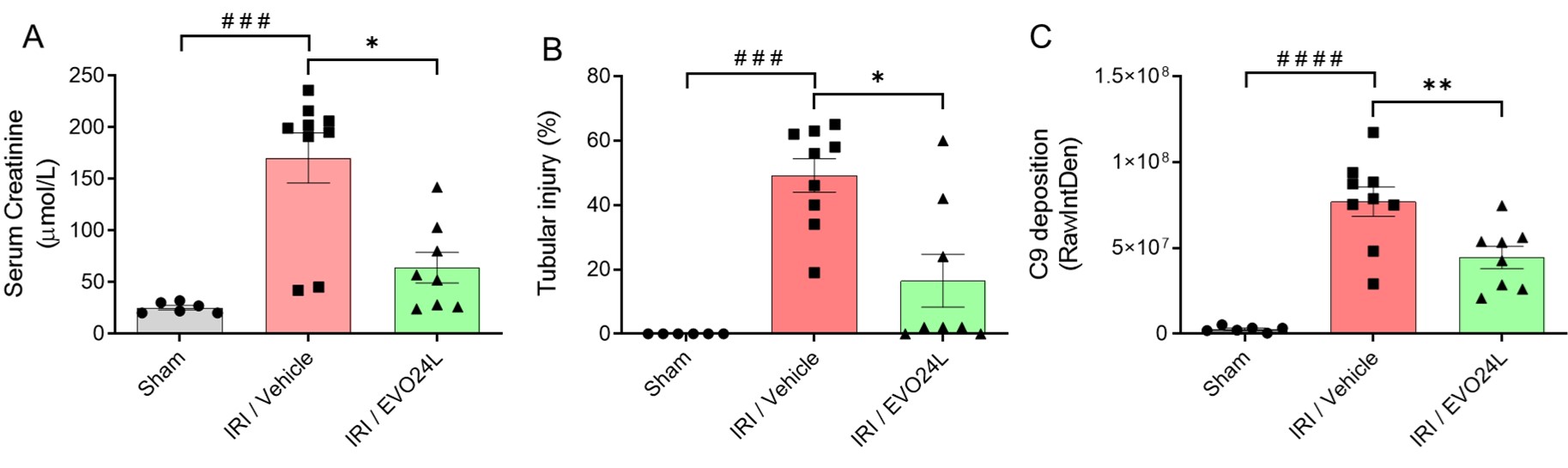 Methods: 10-12 week-old male C57BL/6 mice were subjected to right nephrectomy and left renal ischemia for 22 min (IRI), or nephrectomy only (Sham). Mice (n=8/group) were treated with 2 doses of EVO24L or vehicle control: 2 h pre-ischemia (600 mg/kg i.p.) and immediately post-reperfusion (300 mg/kg i.v.). Mice were euthanized 24 hr post-reperfusion, and serum and plasma samples were collected to assess renal function (serum creatinine, urea) and complement activation (C5a). Kidneys were harvested to analyse histopathology (tubular injury), complement C9 deposition and immune cell infiltration (neutrophils and macrophages).