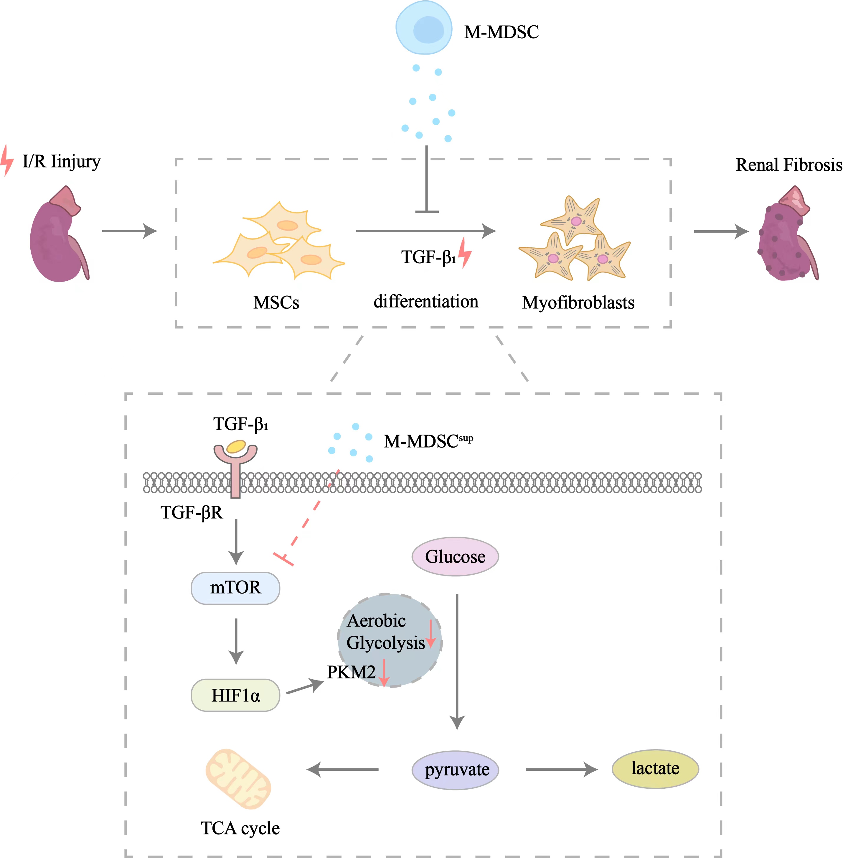 Methods: In vitro, Murine bone marrow progenitor cells were harvested to sort M-MDSC by flow cytometry after induced culture. Bone marrow MSCs were collected 24 hours after TGF-β1 and M-MDSC supernatant treatment to be analyzed by RNA sequencing and untargeted metabolomics. A seahorse XF96 Flux Analyser (Seahorse Bioscience) was used to measure the metabolic profile and metabolic alterations of MSCs. The expression of glucose metabolic-related and fibrosis-related genes were assessed by quantitative polymerase chain reaction (qPCR), flow cytometry and Western blotting (WB). In vivo, M-MDSC supernatant was administered following unilateral renal ischemia-reperfusion injury (IRI) to observe the severity of renal fibrosis and the myofibroblastic differentiation of renal resident MSCs in a murine model. The severity of renal fibrosis was assessed by pathological staining, and the myofibroblastic differentiation of renal resident MSCs was evaluated by immunofluorescence.