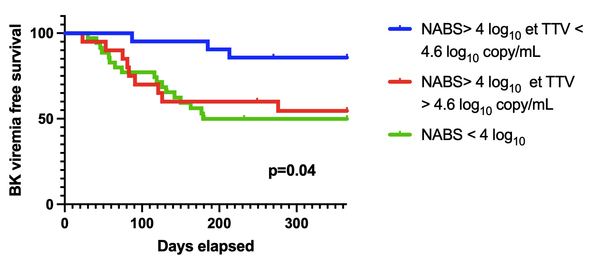 Results: The median age was 56 years with an IQR of 49-65.7. Regarding immunosuppressive therapy, 58% were under anti-human thymocyte immunoglobulin, and 67% were under tacrolimus, all under MMF. At one year, BKPyV viremia occurred in 18 out of 35 patients with NABS < 4 log10 compared to 13 out of 41 with NABS > 4 log10 (p = 0.06). Overall, the median TTV viral load showed no association with BKPyV viremia (5.2 log10 vs. 4.4 log10 copies/ml, p = 0.07). However, in the "NABS > 4 log10" group, patients with BKPyV viremia exhibited a higher TTV viral load (5.4 log10 vs. 4.3 log10 copies/ml, p = 0.01), while the immunosuppressive regimen, residual levels of calcineurin inhibitors, and the area under the curve of MMF at M1 were similar, regardless of BK viremia. Conversely, in the "NABS < 4 log10" group, BKV replication was not associated with a higher TTV viral load (4.8 log10 vs. 4.9 log10 copies/ml, p = 0.72). NABS titer and TTV viral load stratified our population into three distinct risks of BKPyV replication (Figure 1). Interestingly, the median time to the onset of viremia is longer in the group "NABS > 4 log10 and TTV viral load > 4.6 log10" compared to the two other groups, with medians of 191 vs 91 (p=0.03).