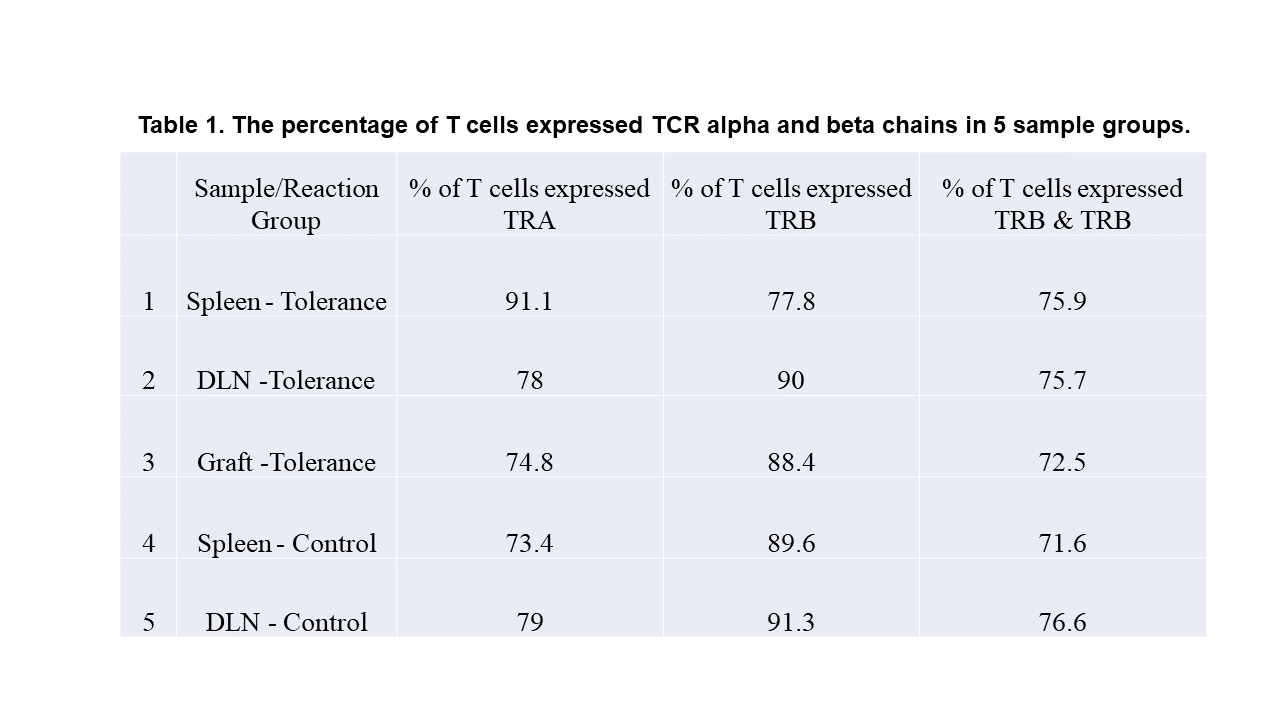 Results: 7621-16989 single cells/group passed QC filters and individual mouse cells within each group were identified. Transcriptomic profile showed 97%-99.7% of sorted cells were T cells containing naïve/resting and memory CD4+ and CD8+ T cells, NKT, CD8+Foxp3+, γδ T cells, and Tregs. A subset of cells expressed both TCR and B cell receptor was identified. A high Treg proportion was confirmed in tolerant mice. Interestingly, a high proportion of NKT cells (15 TRBV families) was observed in tolerant grafts. 74%-91.1% of T cells expressed TCR alpha (TRA), 77.8%-91.1% of T cells expressed TCR beta (TRB), and 71.6%-75.9% of T cells expressed both TRA and TRB (Table 1). While all 22 TRBV families were detected on Tregs of tolerant mice, a high proportion of Tregs that expressed TRBV29 was identified in both lymphoid organs and grafts of tolerant mice.