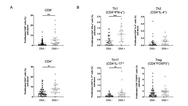 Results: In pathological analyses, none of the patients in the DSA− group showed incidents of rejection, whereas three DSA+ patients developed acute antibody-mediated rejection, 17 DSA+ patients developed chronic antibody-mediated rejection, and 8 DSA+ patients had not yet shown indications of rejection. The MLR assay revealed that the anti-donor CD8+ and CD4+ T cell responses were significantly higher in DSA+ patients than DSA- patients (Figure 1A). To identify CD4+ T cell subsets that showed expansion, responder T cells from DSA− and DSA+ patients were stained for INF-γ, IL-4, IL-17, and FOXP3. Proliferating CD4+ T cells showed a marked increase in Th1 (CD4+INF-γ+) and Th17 (CD4+IL-17+) responses in DSA+ patients than in DSA− patients (Figure 1B). In a comparison between anti-donor and third-party responses, the anti-donor CD8+ and CD4+ T cell response was significantly lower than the anti- third-party response in DSA- patients (Figure 2A). In DSA+ patients, the anti-donor CD8+ T-cell response was significantly lower than the third-party response. In contrast, CD4+ T cell proliferation was similar in the donor and third-party, indicating that donor-specific hyporesponsiveness of CD4+ T cells was absent in DSA + patients (Figure 2B).