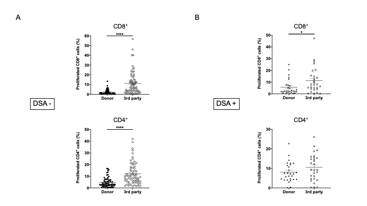 Method: In total, 96 patients who underwent a human leukocyte antigens incompatible kidney transplantation between 1999 and 2020 were enrolled in the study. Among these recipients, 68 patients were negative for DSAs (DSA−) and 28 patients were positive for DSAs (DSA+). A mixed lymphocyte reaction (MLR) assay was implemented to assess the direct pathway response. To improve the accuracy of T-cell alloreactivity via the direct pathway, we used isolated T cells as responders, and this excluded the T cell response via the indirect pathway.