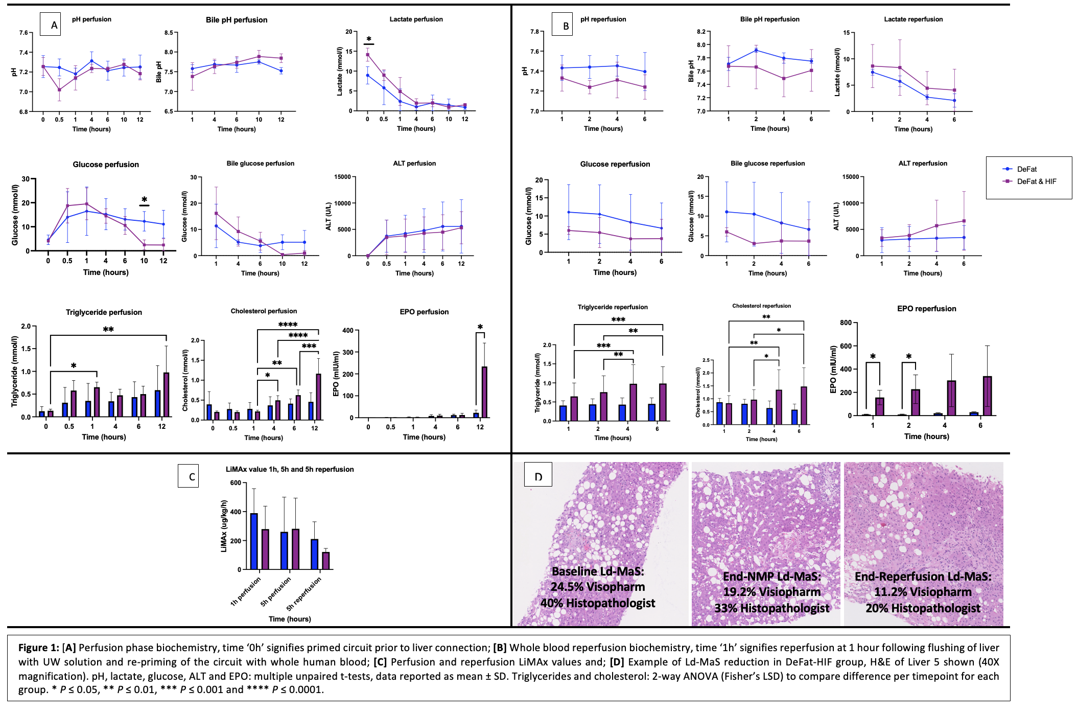Methods: Six sequential discarded livers (DeFat, n=3 and DeFat-HIF, n =3) were perfused with pRBC using the OrganOx metra over 12h, flushed and reperfused for 6h with whole blood (ex-situ transplant model), (Table1). Global hepatocellular function was measured using the LiMAx test. Macrosteatosis (MaS) was quantified using Visiopharm® digital image analysis software and blinded histopathologist report. HIF activation was determined through serial perfusate EPO measurements.