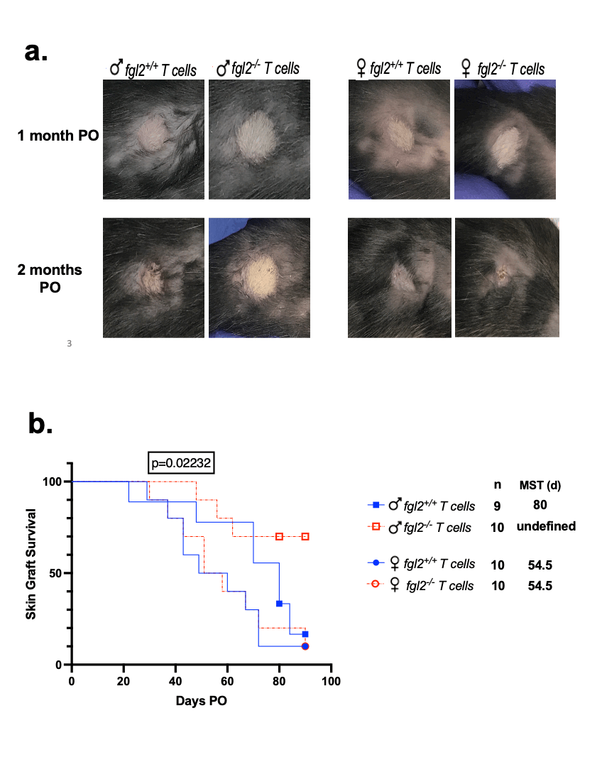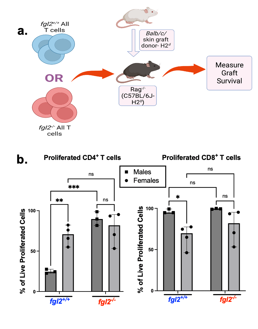 Conclusion: Our data reveal that fgl2 exerts its influence on allograft rejection in a sex-dependent manner and suggest that T cell-extrinsic sources of fgl2 can contribute to T cell regulation. Further investigation is now underway. Future studies of fgl2’s underlying mechanisms must incorporate biological sex as a variable.