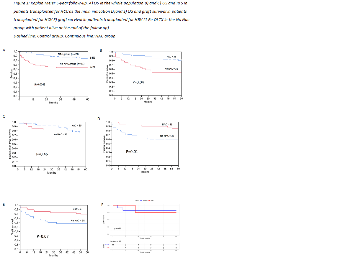 Results: 140 donors were enrolled: 69 in the NAC protocol and 71 in the control group. The 5-year OS was 84% in the NAC protocol compared to 63% in the control (p=0.0045). In LT for HCC, the OS at 5 years was 80% and 55% in the study group and control group, respectively (p=0.04, figure 1B), with no statistical difference in the RFS (p=0.46, figure 1C). Furthermore, in cost analysis, the resources needed for the NAC protocol is negligible compared to the control group. The same beneficial tendency of NAC protocol application has been seen in the other organs (lungs, hearts, pancreas, and intestine)