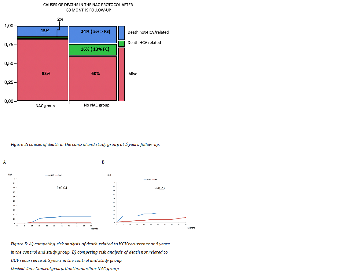 Background: Liver transplantation (LT) is the main indication for the treatment of end-stage liver disease but have to face organ shortages. Using marginal donors is an option to increase the donor pool. Previous studies showed that the graft procured using N-acetylcysteine (NAC) provides a longer survival compared to perfusion with standard solutions, especially in marginal liver donors (EDITORIAL Mone et al. LiverTranspl., Vol. 19, No. 2, 2013). We now evaluate the effect of NAC perfusion compared to control (no NAC protocol) at a 5-year follow-up, with a special focus on the overall survival (OS) and graft survival in the different underlying liver diseases.