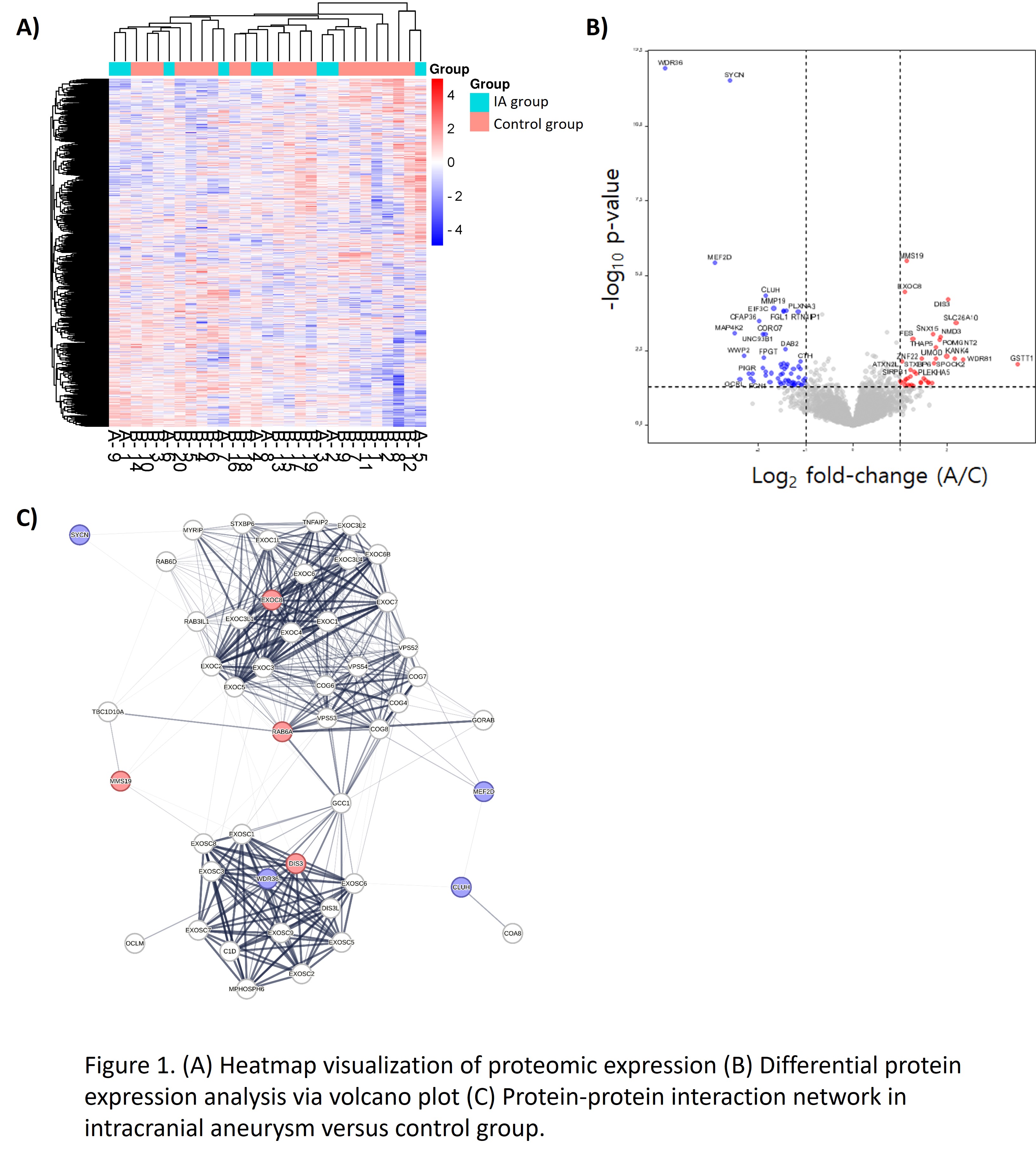 Method: Pre-kidney transplantation ADPKD patients underwent cranial CT and/or MR angiography, with findings dictating assignment to either a control group (ADPKD without IA, n=20), an IA group (ADPKD with IA, n=9). During transplantation, bilateral nephrectomy was performed and native renal arteries were sampled for proteomic analysis via a liquid chromatography-tandem mass spectrometry. Differentially expressed proteins were subjected to bioinformatic analysis and a protein-protein interaction network analysis.