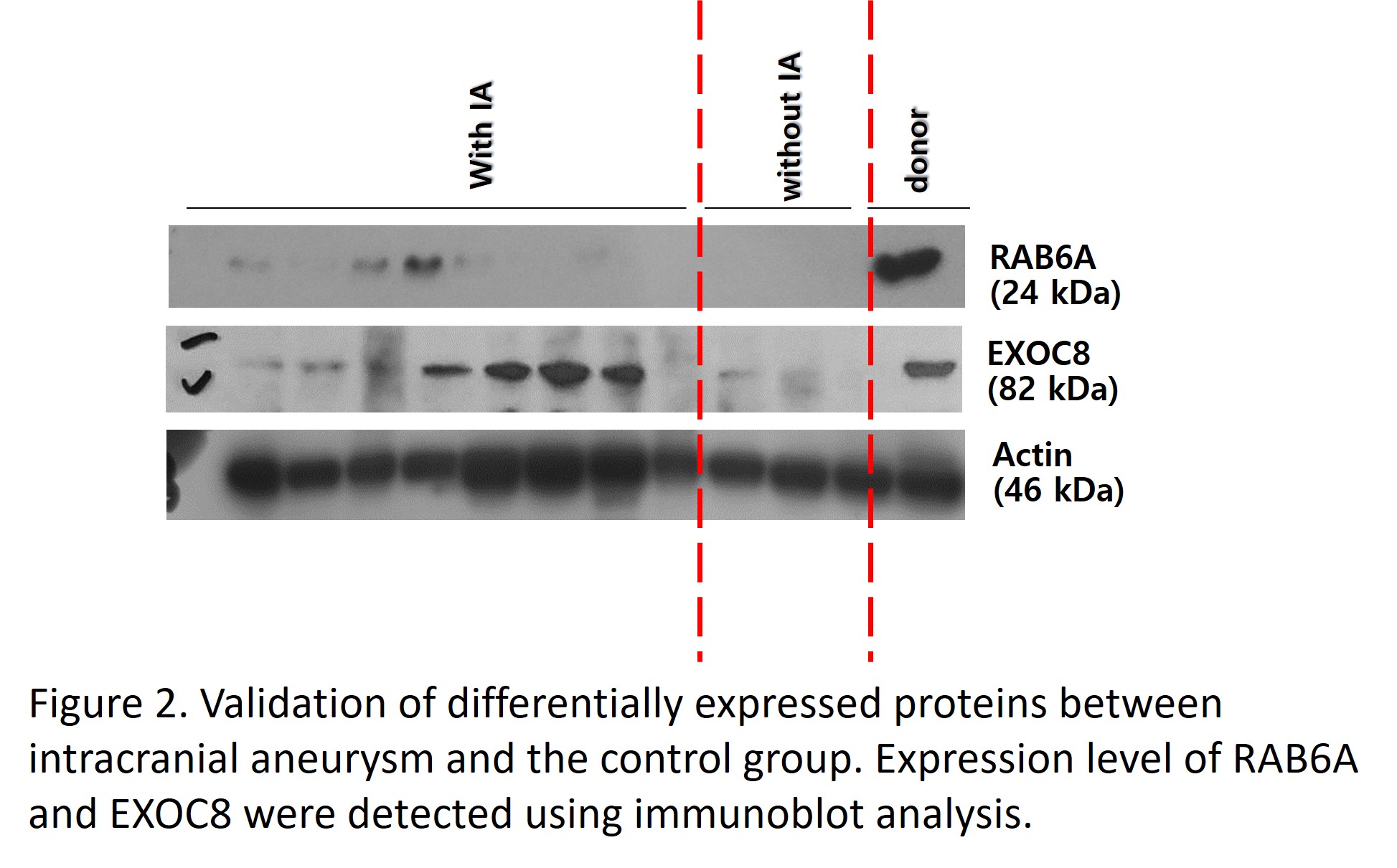 Results: Eight proteins showed significant variation between IA and control groups, with four proteins upregulated (DIS3, MMS19, EXOC8, RAB6A) and four downregulated (CLUH, SYNC, MEF2D, WDR36) in IA group (Log2 fold change (FC) >2 and false discovery rate [FDR] q-value <0.05) compared to the control group. These proteins correlated with pathways implicated in IA development, such as ciliopathy, exocytosis, inflammation, extracellular matrix remodelling, and apoptosis. These proteins were quantitatively validated using immunoblot and found to be consistent with proteomic data. Moreover, a connection was observed between protein expression and clinical metrics (bilirubin, prothrombin time, platelet count), indicating their potential as early diagnostic markers.