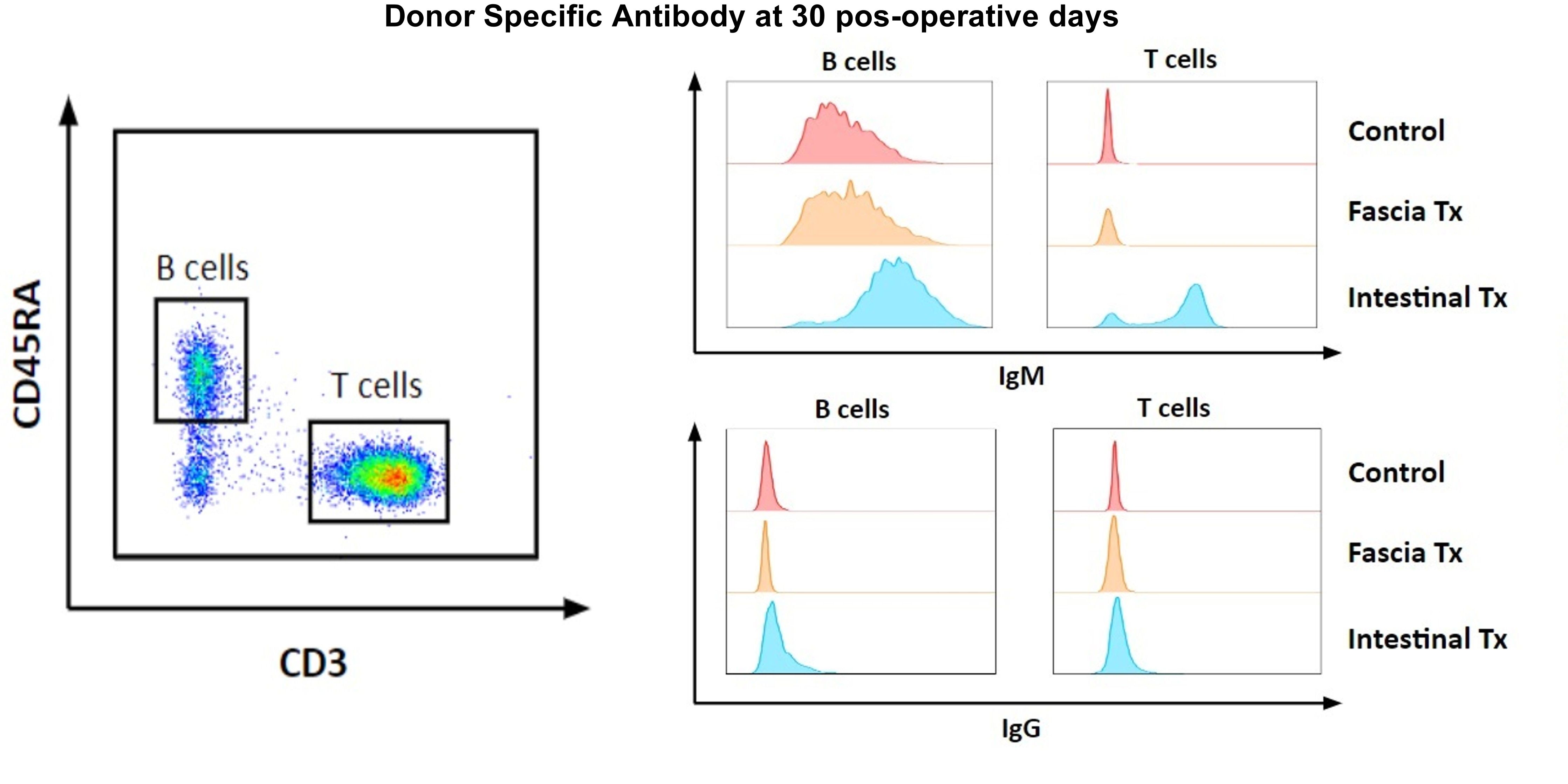 Materials and Methods: 34 TxARFs were performed in rats following our previous report, 32 were including; 16 Isogenic (ISO) and 16 Allogeneic (ALLO) TxARF without immunosuppression; 6 non-transplanted ARFs were taken as control group (Ct). PetScan of the graft was performed on some recipients at 30 and 120 pos-operative days (POD). Rats were sacrificed at 30 or 120 POD, fascia samples were taken for Masson's Trichrome, immunohistochemistry of CD3+ cells and mechanical properties studies. Tissue resistance was shown as the immediate force increase from a stretching stimulus (peak force, Fig.1), measured with a Letica Scientific Instruments force transducer. Flow cytometry was performed to determine the relative amounts of CD4+ and CD8+ T cells, and the turnover of hematopoietic cells in the graft using GFP+ rats as recipients. The presence of Donor Specific Antibody (DSA) in serum was evaluated (Fig.2). Statistical tests of Normality and One-way ANOVA tests were used for the analysis.