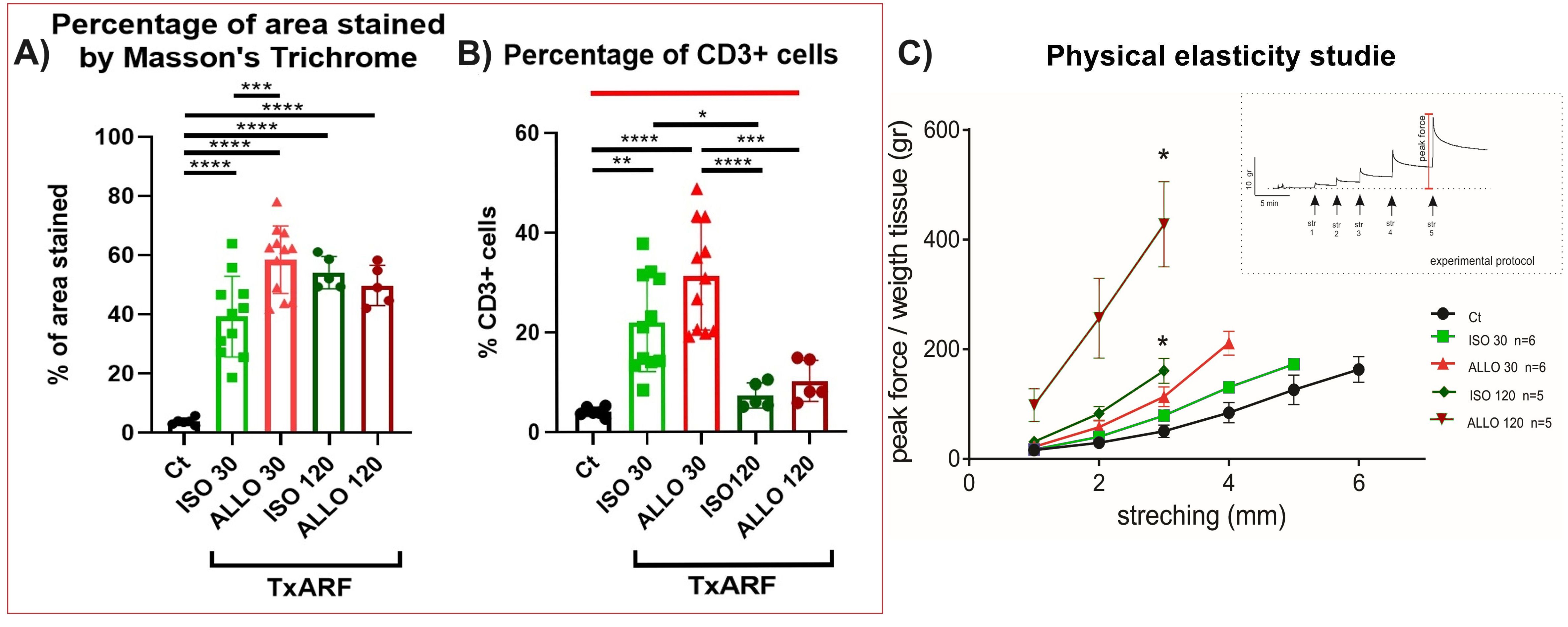 Conclusion: The increase in collagen fibers is compatible with a progressive fibrosis process that could be associated with the changes in mechanical tissue properties observed at 120 POD. However, the absence of inflammatory activity by PetScan, the low percentage of samples with DSA without immunosuppression and, the marked decrease in the percentage of CD3+ cells between 30 and 120 POD in ISO and ALLO, suggest a non-immunological origin of the fibrotic process. Although more studies are necessary, these results open the door to studying the potential usefulness of TxARF in non-transplantation.