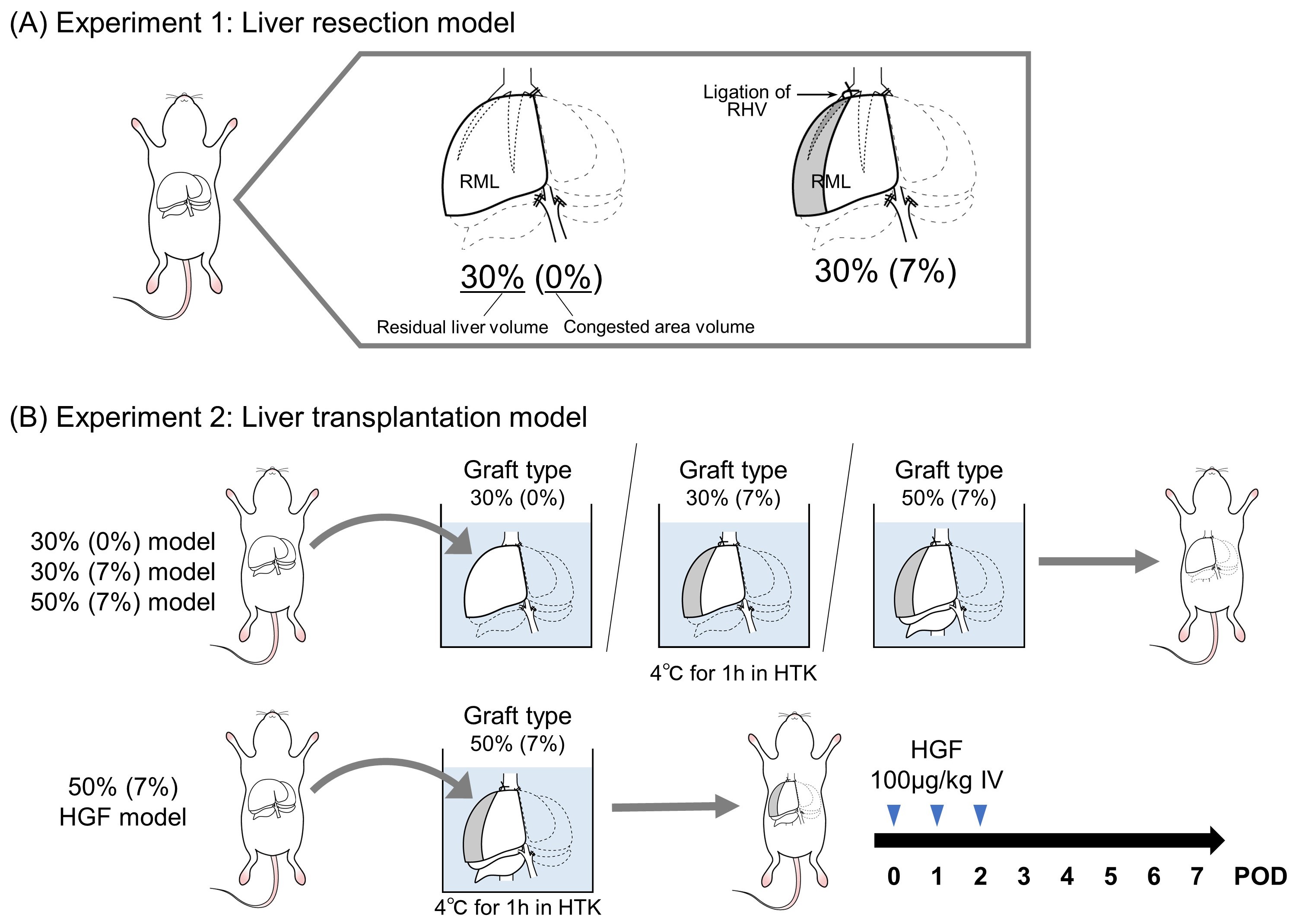 In addition to 30% (0%) and 30% (7%) models, the 50% residual liver (RML and the right lobe) model with ligation of RHV (50% [7%] model) was used as a graft. Additionally, some rats in the 50% (7%) model received recombinant human hepatocyte growth factor (HGF) administered at 100 µg/kg immediately after transplantation and on postoperative (POD) 1 and POD2. The 50% (7%) model with HGF administration was defined as the 50% (7%) HGF model.