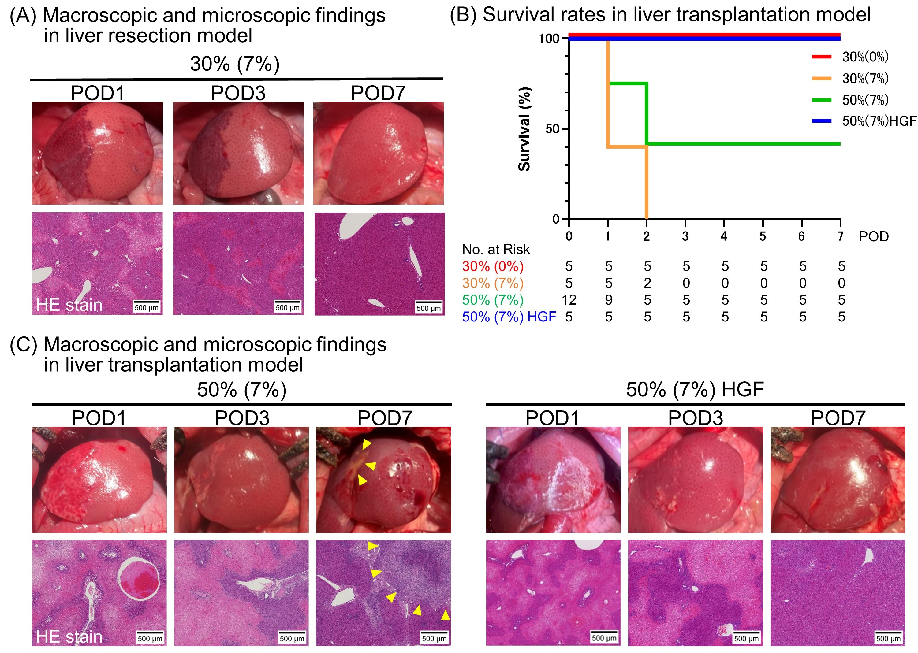 Results: In the liver resection model, all rats in the 30% (0%) and 30% (7%) models survived until POD7. In 30% (7%) model, the microscopic findings showed hepatocyte loss in the congested area on POD1; however, the congested area recovered to completely normal on POD7 (Figure 2A). In the transplantation model, while the survival rate of the 30% (0%) model was 100%, no rats in the 30% (7%) model could survive until POD3 (Figure 2B). The 50% (7%) model also exhibited a significantly worse survival rate than the 30% (0%) model (p=0.039), even though the 50% (7%) model had a larger normal (non-congested) volume than the 30% (0%) model. Some congested areas in the 50% (7%) model exhibited necrosis and abscesses on POD7 (Figure 2C, yellow triangles). The survival rate of the 50% (7%) HGF model was 100% and significantly better than that of the 50% (7%) model (p=0.039) (Figure 2B). The 50% (7%) HGF model exhibited significantly fewer necrotic areas in the congested area than the 50% (7%) model on POD7 (p<0.05) (Figure 2C).