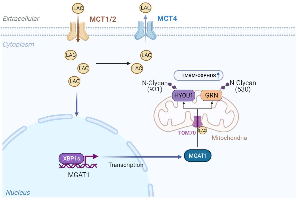 Results: Lactate promotes suppressive function and OXPHOS of memory and naïve Tregs. A high lactate environment increases MGAT1 expression in memory and naïve Tregs by mitochondrial proteomics. Lactate increases N-glycosylation of GRN and HYOU1 to promote Treg OXPHOS via MGAT1. Mitochondrial function of Treg declines after MGAT1 knockdown. A high lactate environment elevates XBP1s facilitates MGAT1 transcription. TOM70 is essential for the mitochondrial translocation of MGAT1 in high lactate environment. MGAT1 knockdown attenuates the therapeutic effect of Treg in a Xeno-GvHD model.