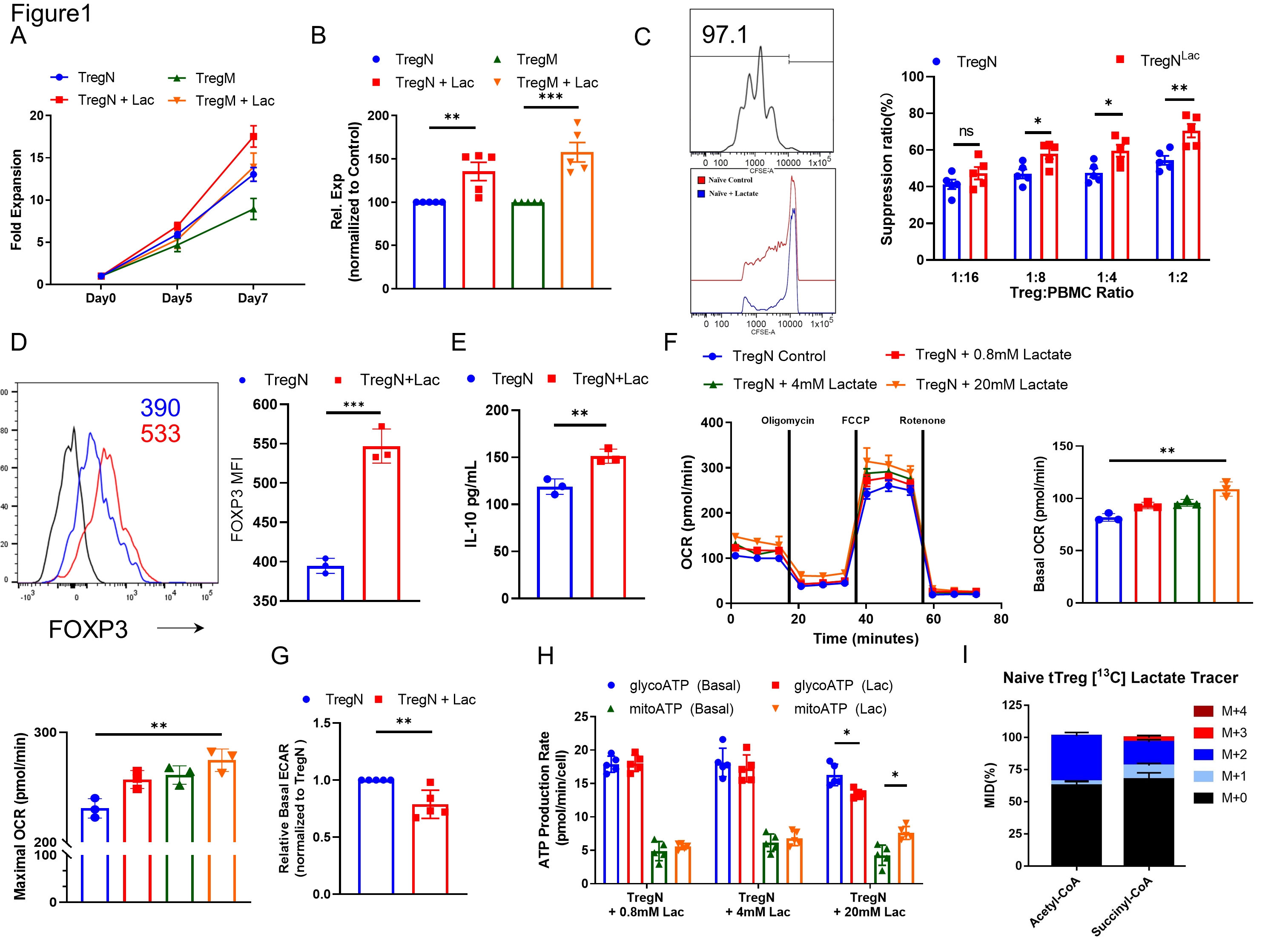 Introduction: Current research reports that lactate affects Treg metabolism, although the precise mechanism remains partially understood. In this study, we present evidence demonstrating that elevated lactate levels significantly enhance cell proliferation, suppressive capabilities, and oxidative phosphorylation (OXPHOS) in human Tregs. The expression levels of Monocarboxylate Transporters 1/2/4 (MCT1/2/4) regulate intracellular lactate concentration, thereby influencing the varying responses observed in naive Tregs and memory Tregs. Through mitochondrial isolation, sequencing, and analysis of human Tregs, we have determined that N-acetylglucosaminyltransferase I (MGAT1) serves as the pivotal driver initiating downstream N-glycosylation events involving GRN and HYOU1, consequently enhancing Treg OXPHOS. The mechanism by which MGAT1 is upregulated in mitochondria depends on two key factors: Elevated intracellular lactate promotes the activation of XBP1s, which, in turn, supports MGAT1 transcription. Furthermore, lactate interacts with the translocase of the mitochondrial outer membrane 70 (TOM70) import receptor, facilitating the translocation of MGAT1 into the mitochondria. Pre-treatment of Tregs with lactate significantly reduces mortality in a xenogeneic graft-versus-host disease (GvHD) model. These findings underscore the active regulatory role of lactate in human Treg metabolism through the upregulation of MGAT1 transcription and its facilitated translocation into the mitochondria.