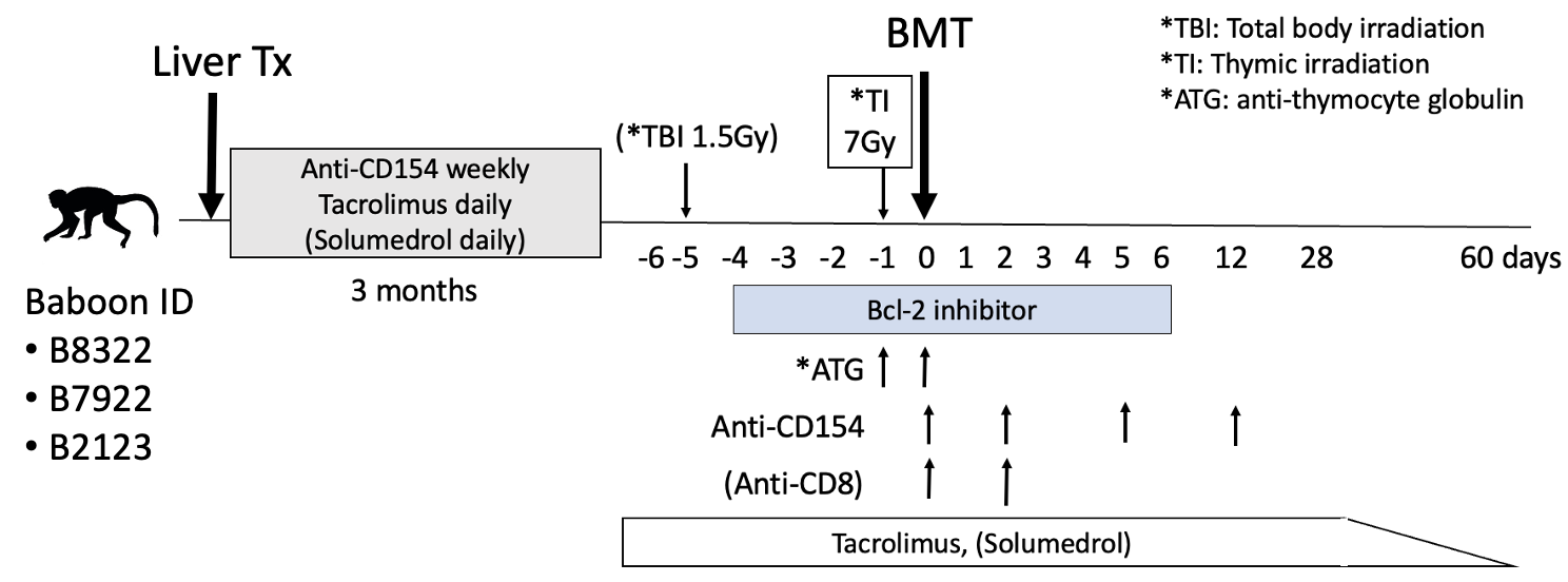 Method: Three baboons received allogenic orthotopic liver transplantation and were treated with an immunosuppressive regimen (anti-CD154 antibody, tacrolimus, and steroid). The recipients received a delayed BMT with conditioning immunosuppression therapy 3 months after liver transplantations. All three recipients were treated with Bcl-2i based BMT conditioning regimens which included peri-transplant Bcl-2i, anti-thymocyte globulin (ATG), anti-CD154 antibody, thymic irradiation, and a two-month post-BMT course of tacrolimus. All immunosuppression medications were discontinued 2 months after BMT. As the first recipient failed to develop mixed chimerism, low dose (1.5Gy) total body irradiation (TBI) and anti-CD8 antibody were added in the second recipient. The third recipient received TBI without anti-CD8 antibody.