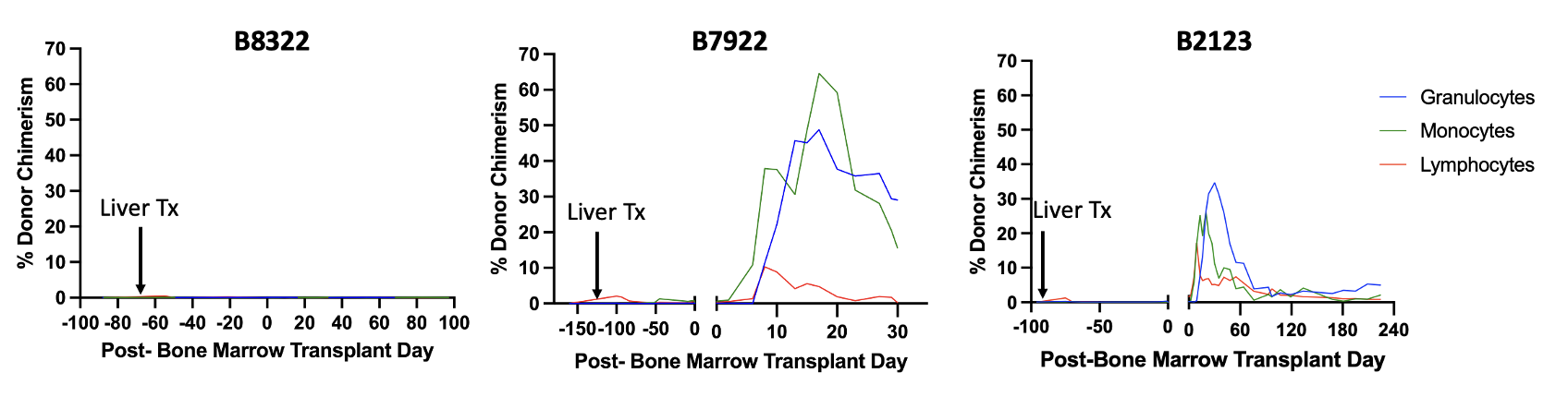 Results: Immediate post-operative courses of all three liver transplants were uneventful. The first recipient (B8322) failed to develop mixed chimerism and rejected the liver while tapering off immunosuppression (57 days after BMT). By adding low-dose TBI and anti-CD8 antibody, the second recipient (B7922) successfully developed mixed chimerism (Lymphocytes 10.3%, Granulocytes 48.8%, Monocytes 64.6%). However, the recipient was lost due to sepsis secondary to cholangitis 30 days after BMT. Therefore, in the third recipient (B2123), anti-CD8 antibody was omitted. This recipient successfully developed mixed chimerism (Lymphocytes 17.2%, Granulocytes 34.7%, Monocytes 26.3%) and achieved long-term immunosuppression-free liver allograft survival (>224 days after BMT). No donor specific antibody has been detectable and a liver biopsy on post-op day 216 only showed non-specific mild portal tract inflammation.