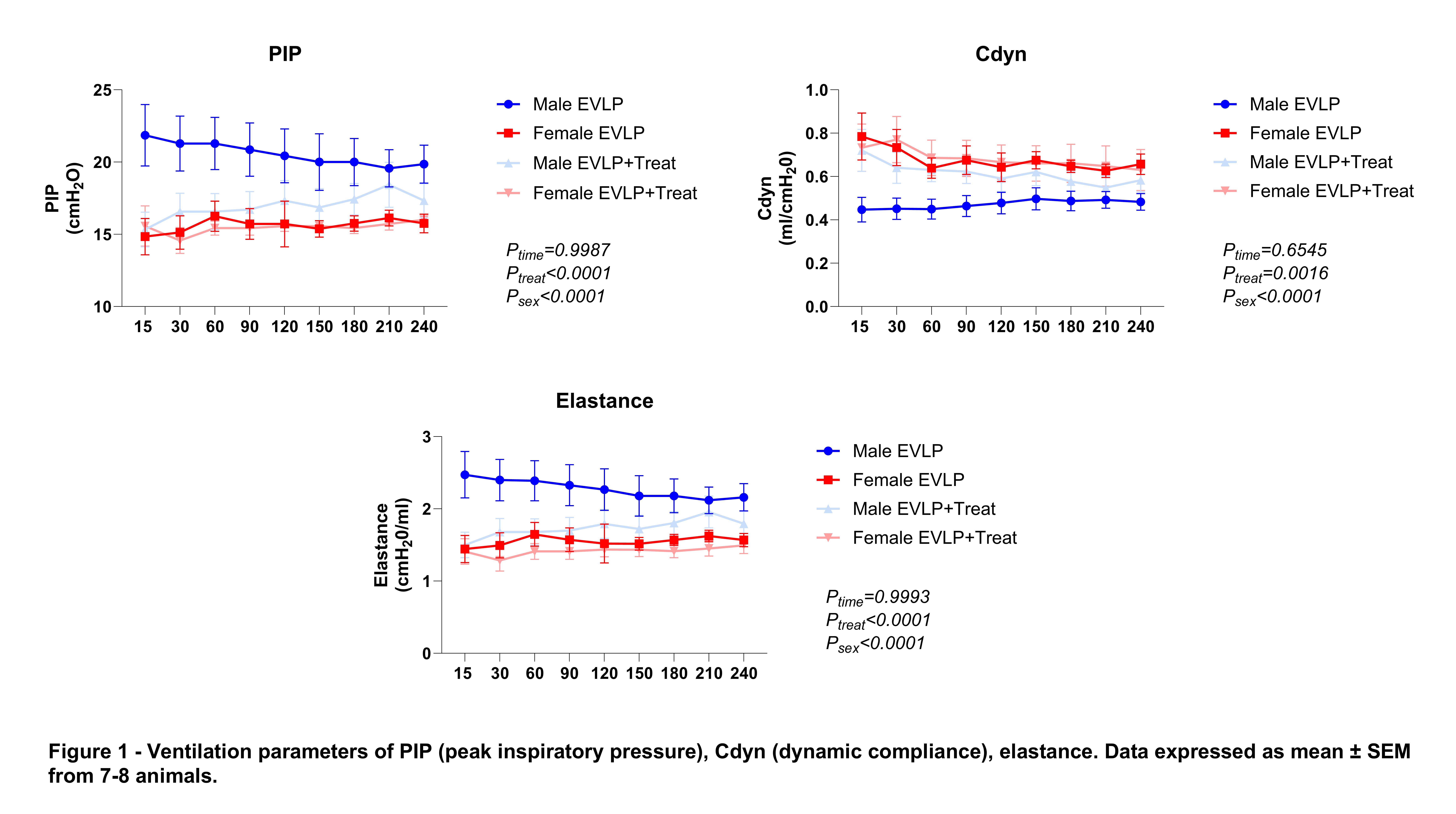 Results: After BD, males presented higher IL-1β in comparison to females in lung homogenate (p=0.0011) however, after 24h lung tissue culture, females presented increased IL-1β levels in comparison to males (p=0.0403). In the perfused groups, treatment was able to improve perfusion flow in both male and female lungs (p<0.0001). LDH was increased in male groups in comparison to respective female groups (p<0.0001). Male perfused groups presented lower IL-1β in lung tissue after EVLP (p<0.0001) in comparison to BD, while no differences were observed among females. There were no differences in IL-1β among the groups in perfusate. In lung culture, female BD-EVLP+T group presented lower levels of IL-1β (p=0.0143) in comparison to BD. There were no differences in male groups. Regarding lung function analysis during EVLP, non-treated males needed increased peak inspiratory pressure and presented higher elastance, and reduced dynamic compliance in comparison to treated males and both female groups. Some results are represented in figure 1.