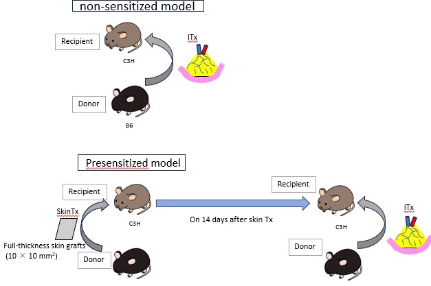 Background: Intestinal transplantation is the ultimate treatment option for short bowel syndrome and irreversible intestinal failure. Despite significant advances in immunosuppression therapy, peritransplant management, and surgical technique during the past few decades, long-term outcomes remain considerably lower than those for other organ transplantations. It has been reported that the presence of preformed DSAs and the formation of de novo DSAs posttransplant are closely associated with increased risk of graft loss due to hyperacute and chronic rejection via antibody-mediated rejection (AMR) in intestinal transplantation. However, its pathogenesis and histopathological characteristics for diagnosis remain unclear. The availability of animal models mimicking human AMR is essential to understand its pathogenesis and develop new treatment strategies. We performed intestine transplantation in presensitized mice with donor skin grafts for the first time and evaluated the histopathology of intestinal grafts.