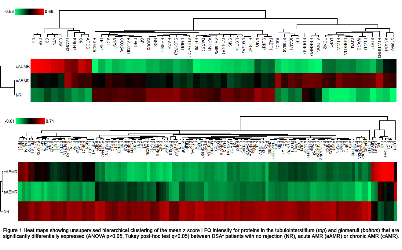 Results: 61 tubulointerstitial and 150 glomerular proteins were significantly differentially expressed between DSA+ patients with NR, aABMR or cABMR (Fig. 1). Patients with cABMR showed significant upregulation of components of the classical complement pathway in the glomeruli (q=6.1x10-5) and of terminal complement in the tubulointerstitium (q=6.3x10-15), as well as significantly decreased expression of tubulointerstitial proteins linked to mitochondrial metabolism (q=1.8x10-5), compared to all other groups. Patients with aABMR showed upregulation of tubulointerstitial proteins involved in MHC (q=3.7x10-6) and IFNγ (8.6x10-6) signaling, as well as decreased expression of glomerular proteins linked to extracellular matrix organization (q=6.7e-3). Lastly, DSA+ NR patients had a significant upregulation of proteins linked to metabolism (TI, q=1.7e-3) and the citric acid cycle (glom, q=2.1e-3), as well as higher expression of podocyte-specific proteins in the glomeruli, as compared to patients with either AMR subtype.