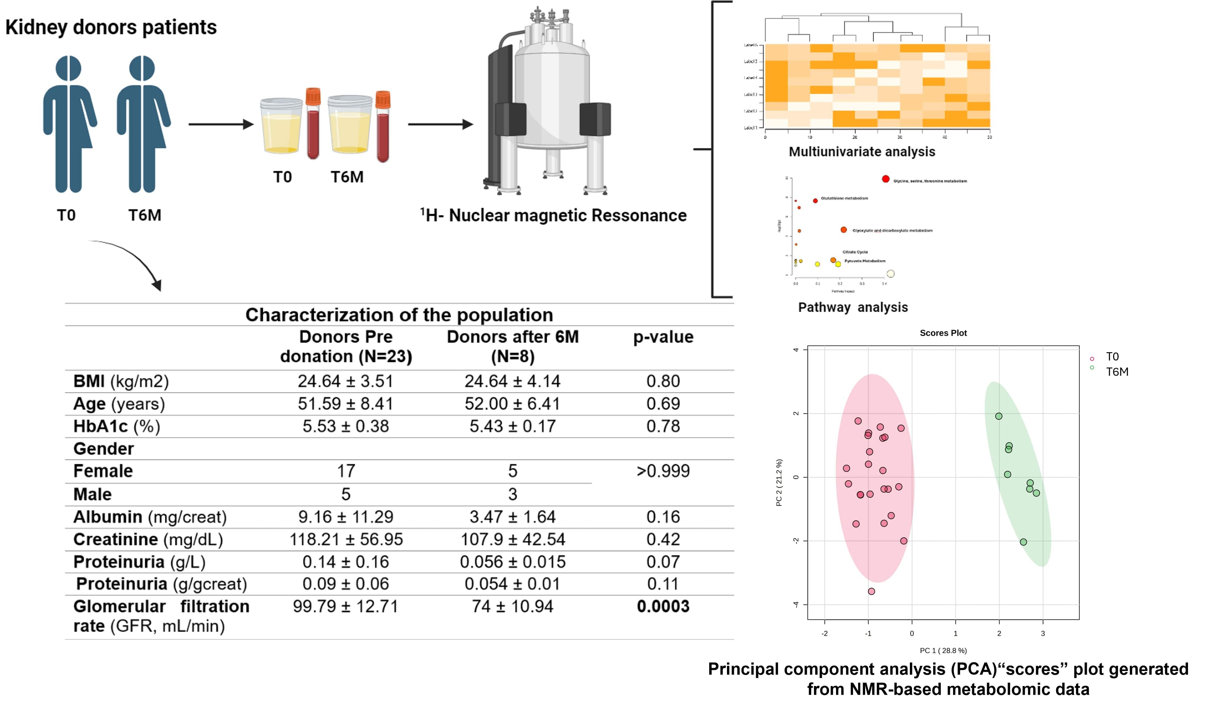 With this approach, we identified 22 metabolites in occasional urine. A principal component analysis (PCA) generated from NMR-based metabolomic data demonstrated that pre and post had significantly different patterns, suggesting the activation of distinct pathophysiological pathways in the early stage after kidney mass loss. Further multivariate analysis revealed that patients (T6M) presented lower values of formate (p=0.048), citrate (p=0.012), dimethylamine (p=0.0003), hypoxanthine (p= 0.001) and betaine (p<0.0001) and higher levels of pyruvate (p<0.0001), glycolate (p=0.0001), sarcosine (p<0.0001) and glycine (p<0.0001), when compared to pre-donation patients.