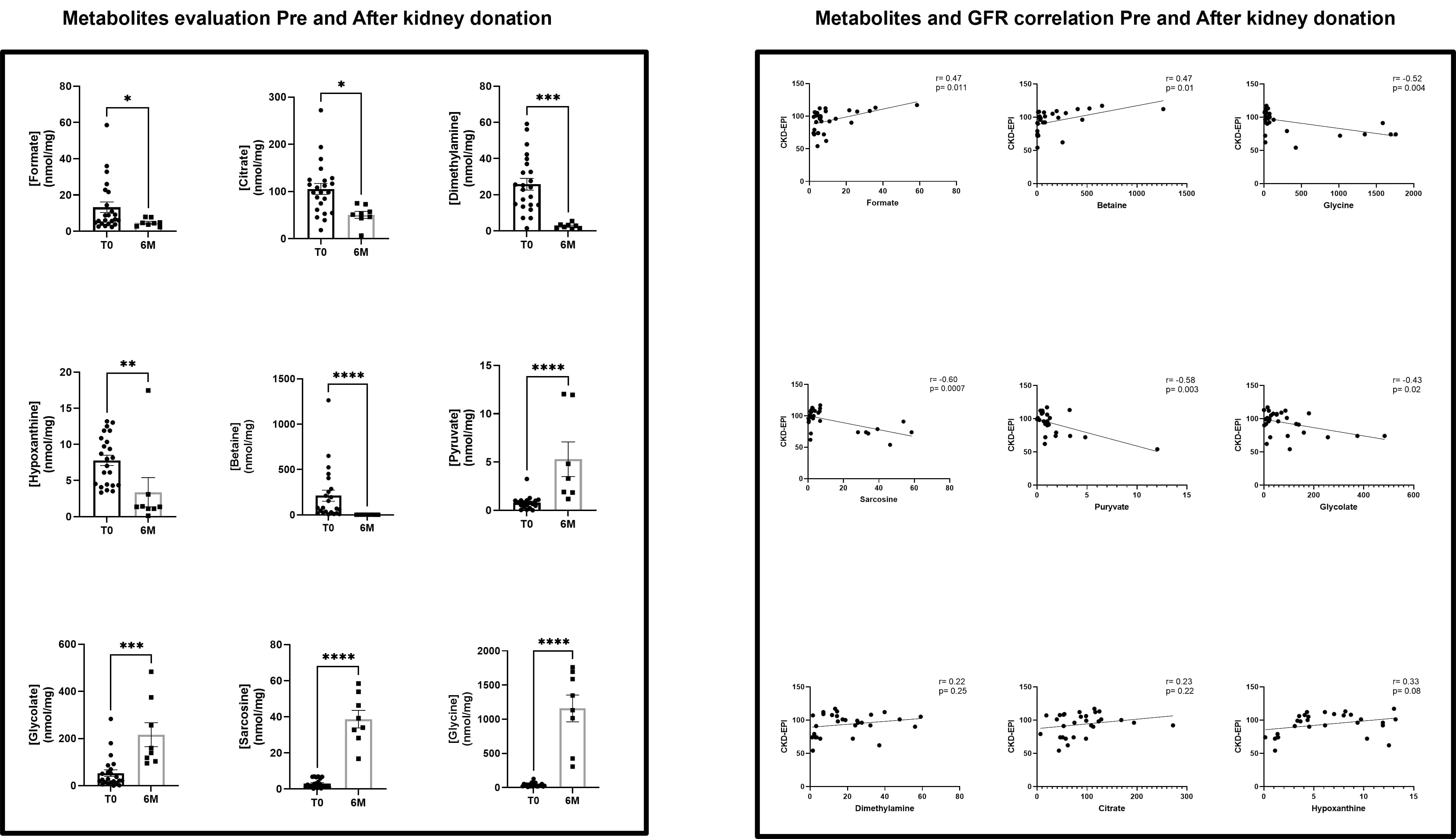 The pathway enrichment analysis results for the dysregulated urinary metabolites in LD revealed the association of the metabolism of mitochondria-associated metabolites, suggesting an impairment of mitochondrial energy production after kidney donation, with the alteration of amino acids that participate on citric acid cycle but also a dysregulation on glycine, glyoxylate and dicarboxylate metabolism Additionally, the patients presented a lower Glomerular filtration Rate (GFR) (74 ± 10.94 vs. 99.79 ± 12.71 mL/min, p=0.0003), and no significant alterations on albuminuria.  Also, we observed a strong negative correlation with glycine (r=-0.52, p=0.004), sarcosine (r=-0.60, p=0.0007) and pyruvate (r=-0.58, p= 0.003), a moderate negative correlation with glycolate (r=-0.43, p=0.02), while a moderate positive correlation between GFR and formate and betaine (r=0.47, p=0.01). To further explore biomarkers of renal lesion, we compared the urinary metabolome evaluated of matched samples from individual patients (N=7) pre and post kidney donation. Apart from formate values, which was unaltered in this analysis, the remain metabolites showed results similar to those of the previous investigation. Also, sarcosine and glycolate appeared to have a weak negative correlation with albuminuria (r=0.35 and r=-0.30, respectively). This pilot study suggests that noninvasive evaluation of metabolome in kidney donors, after a certain period of donation, allied with correlation of GFR could be useful to performed clinical risk stratification and tailored management reinforcing kidney donation safety and health gains.