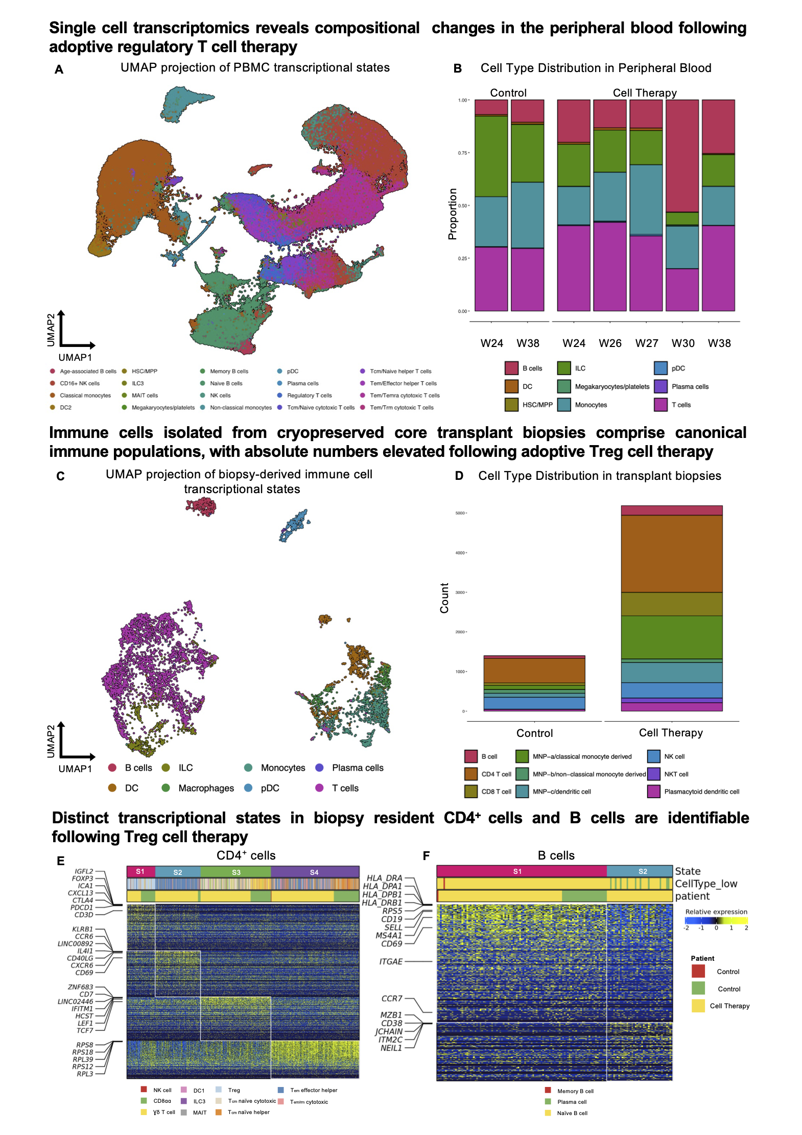 Methods: We performed spatial transcriptomic profiling on six kidney transplant biopsies from four TWO study patients receiving standard-of-care immunosuppression (control, n=2) or Treg ACT (TR001, n=2) using FFPE samples on the 10X Genomics Xenium platform mapping 477 genes with immunofluorescence enabled cell segmentation. In addition, cryopreserved 38-week core biopsies from two control patients and one TR001 patient were enzymatically dissociated and CD45+ lymphocytes isolated by flow sorting. PBMC samples from 6 patients at 5 timepoints (2 control, 3 TR001) and Treg ACT single cell suspensions (n=3) were generated. Gene expression and V(D)J immune receptor libraries were constructed and sequenced for all samples.