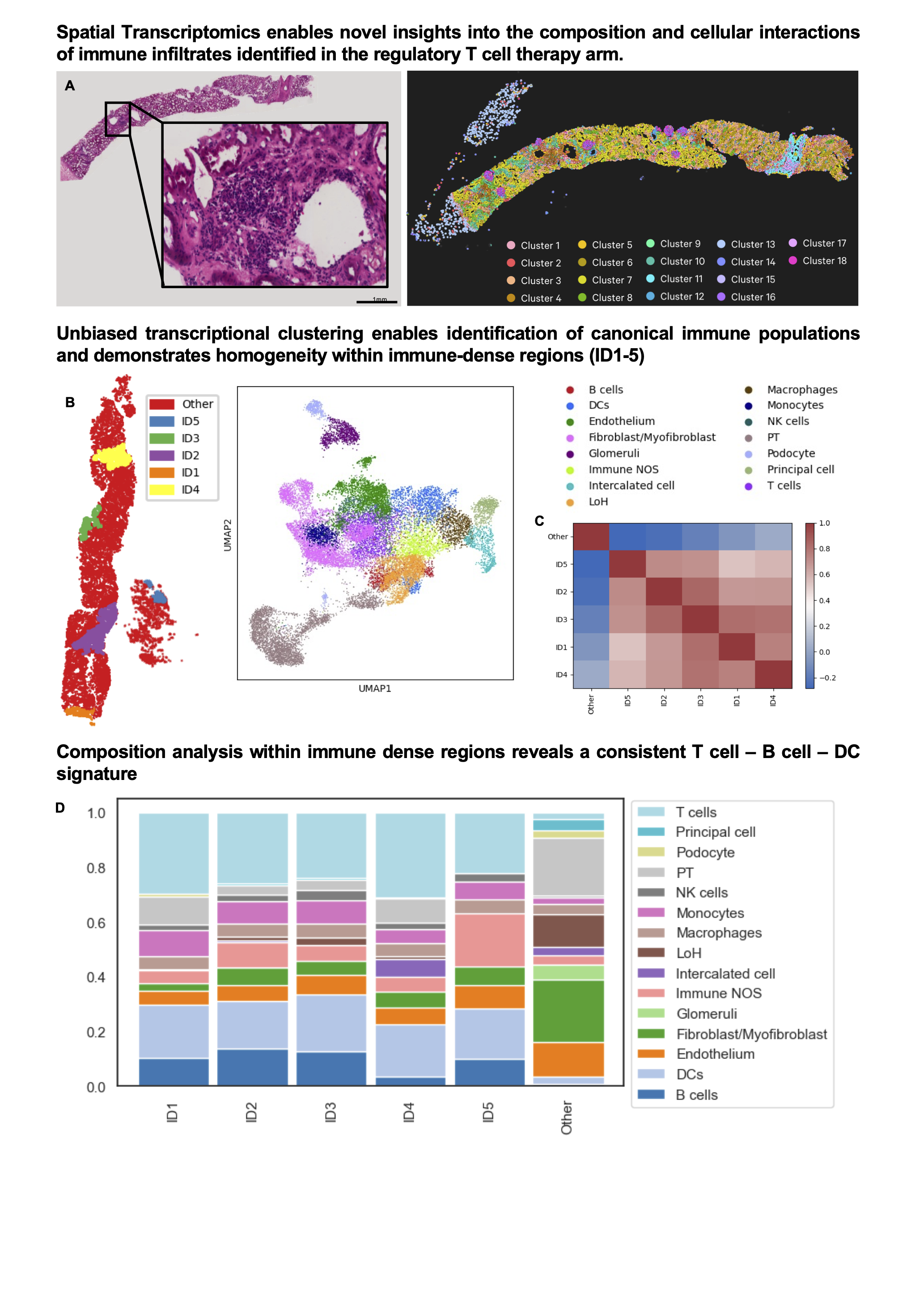 Results: A total of 6,500, 180,000, and 30,000 single cells from kidney biopsies, PBMC, and Treg ACT, respectively, passed QC filtering. Within peripheral blood, a proportional increase in B cells was observed following Treg adoptive transfer (Fig1. A, B). Immune cell recovery from the cell-therapy treated biopsy was significantly elevated and canonical lymphocyte populations were identifiable (Fig. 1C, D). Unsupervised evaluation of conserved and divergent transcriptional states between biopsies confirmed the presence of Tregs in both biopsies, characterised by a gene signature comprising FOXP3, CTLA4, PDCD1 and IGFL2 (Fig 1E). Interestingly a unique B cell state identified by the expression of MZB1, CD38, and JCHAIN indicative of marginal zone B cells was only identifiable within the biopsy of the Treg treated patient (Fig 1F). Spatial transcriptional profiling enabled the identification of renal structures and immune dense regions within transplant biopsies (Fig 2A, B). Immune dense regions (ID1-5) exhibited striking homogeneity (Fig 2C) and were comprised predominantly of T, B cell, and DC subpopulations (Fig 2D).