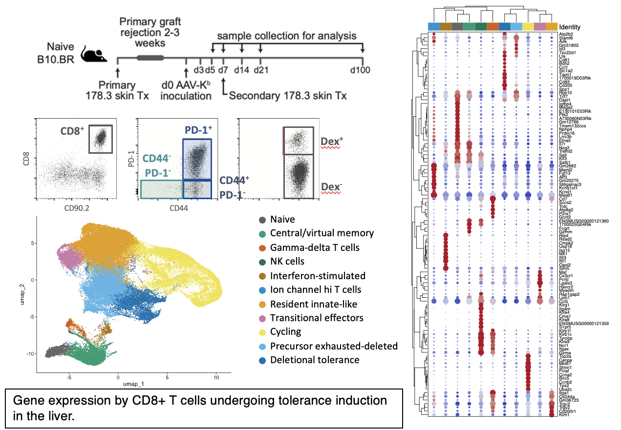 Results: Within the liver CD8+ T cell compartment, cycling cells and cells in the deletional tolerance clusters became progressively less frequent with increasing time post AAV-Kb inoculation, while the proportion of tissue resident cells expressing an “exhausted” gene signature increased. By d14, tissue-resident cells outnumber other populations. Previously-identified public clonotypes were present early during tolerance induction, but declined as a proportion of liver alloreactive T cells as the duration of tolerance increased, suggesting that these clones may be preferentially deleted. CD4+ Tregs were over-represented in accepted skin grafts while the infiltrate of rejecting grafts featured cytotoxic effectors (NK and CD8+ T cells).