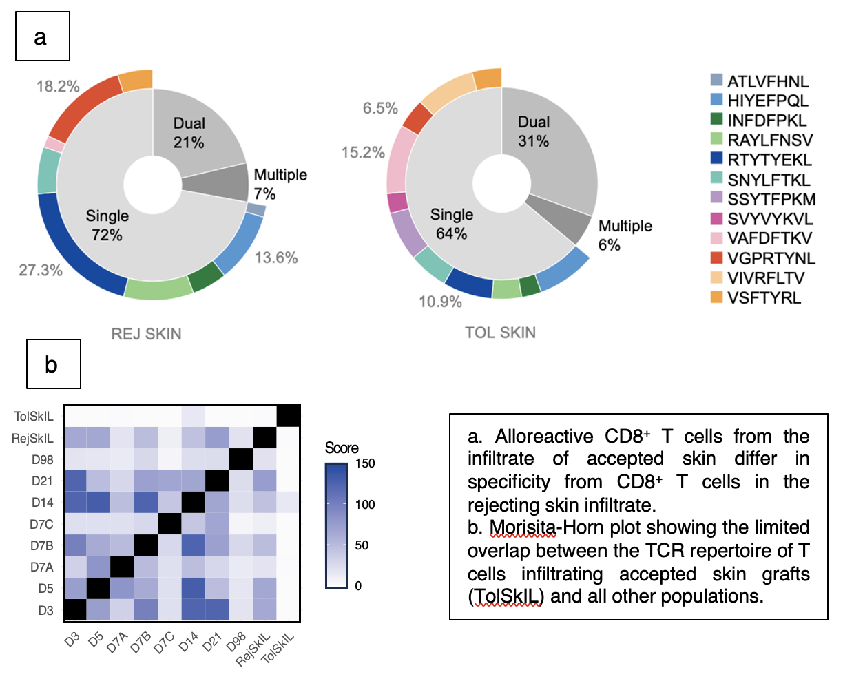 Methods: B10.BR mice underwent secondary skin grafts from transgenic donors mismatched for H-2Kb, with or without prior treatment with a liver-specific AAV vector encoding Kb heavy chain. AAV-Kb treatment induced indefinite graft acceptance. Activated CD8+ T cells were isolated from the liver at intervals from d3-d100 post-inoculation, while infiltrating lymphocytes were isolated from rejecting or accepted skin grafts on d14. Single cells were captured and TCR/transcriptome/surface marker libraries prepared. Specificity was assessed using a panel of 12 Kb-peptide dextramers.