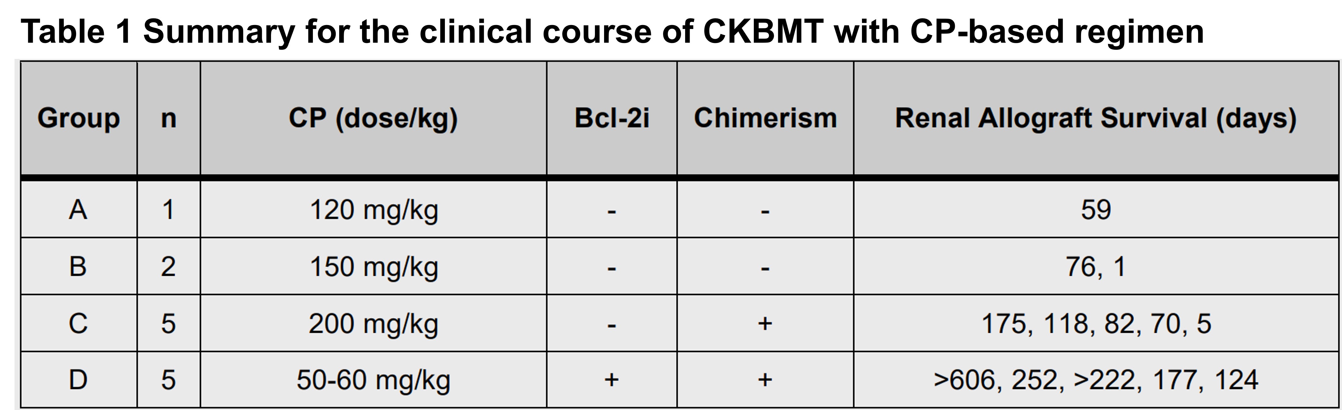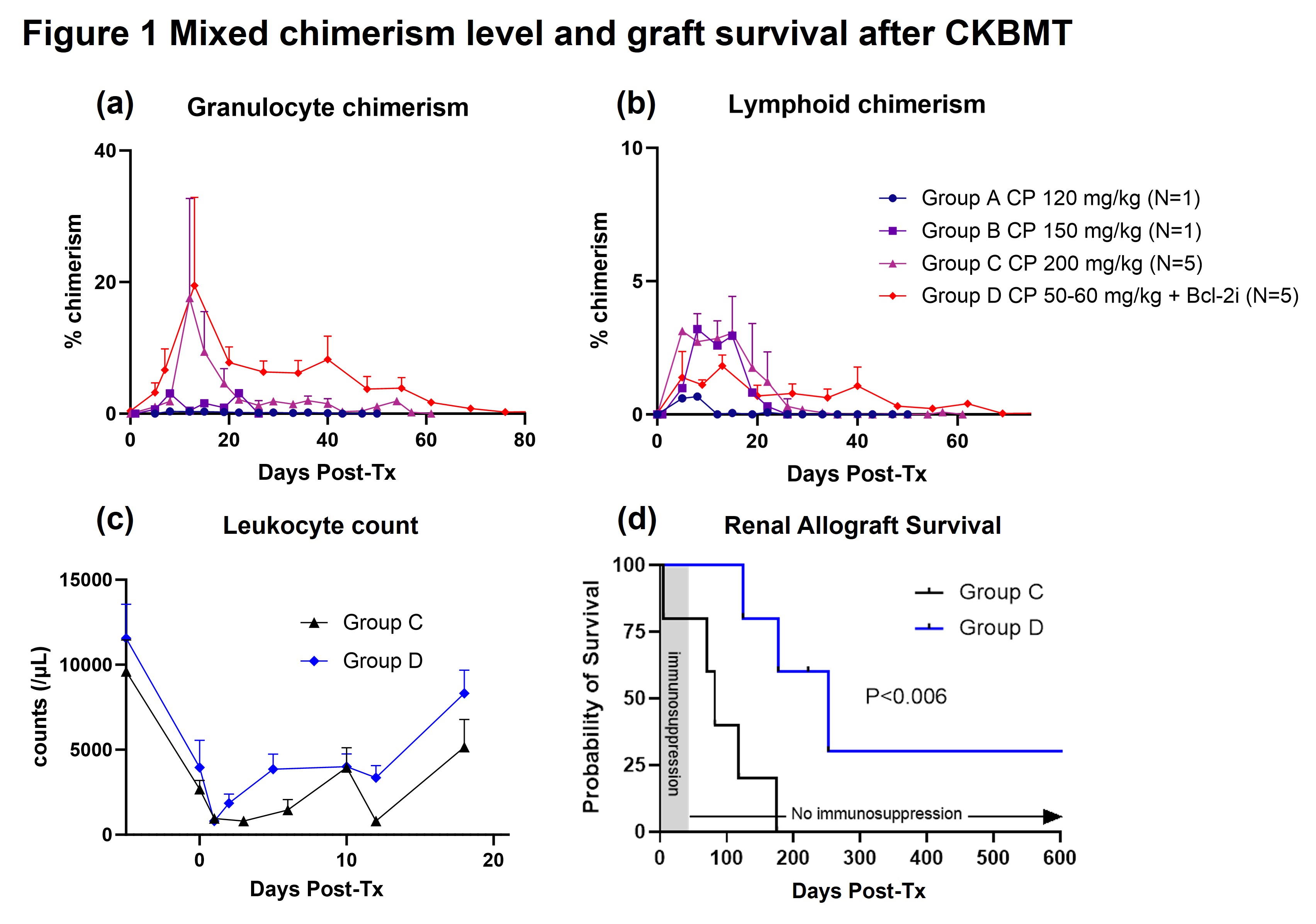 Method: Sixteen cynomolgus monkeys underwent combined kidney and bone marrow transplantation (CKBMT) with a non-myeloablative conditioning regimen, which included CP, local thymic irradiation (7 Gy), anti-thymocyte globulin, anti-CD154 mAb, and a 28-day course of cyclosporine. Following this, no immunosuppression was administered. The total dose of CP varied among groups: 120 mg/kg in two divided doses in Group A, 150 mg/kg in Group B, and 200 mg/kg in Group C. In Groups D, peri-transplant Bcl-2i (daily venetoclax 10 mg/kg Day -4 to Day +6) was added, and the dose of CP was reduced to 50-60 mg/kg. (Table 1).