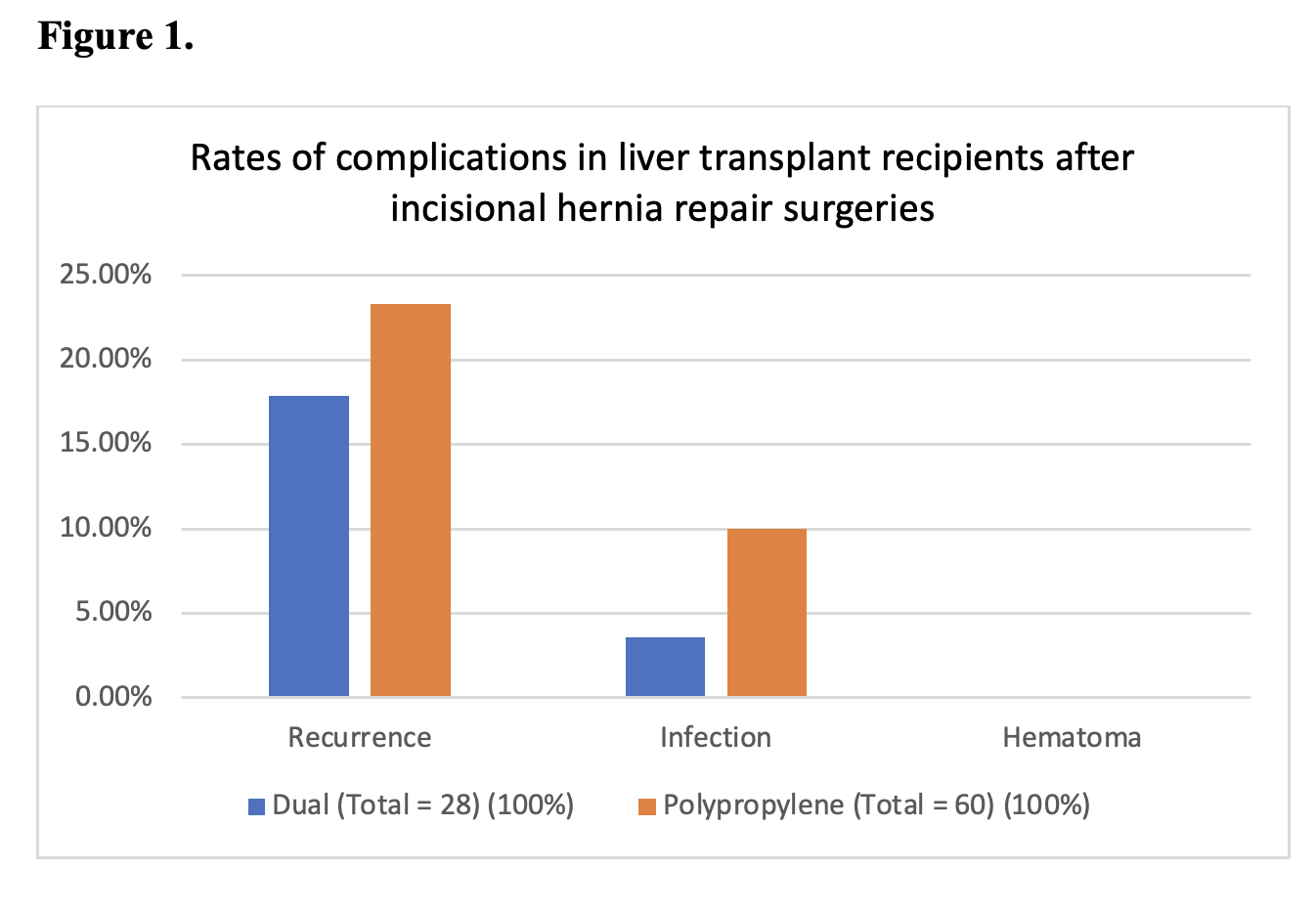Conclusion: Both polypropylene and dual mesh repair methods are effective and safe for incisional hernias post-liver transplantation. While dual mesh exhibited a slightly lower incidence of recurrence and infection, the differences were not statistically significant. Further research should explore optimal repair strategies to enhance outcomes in this patient population.