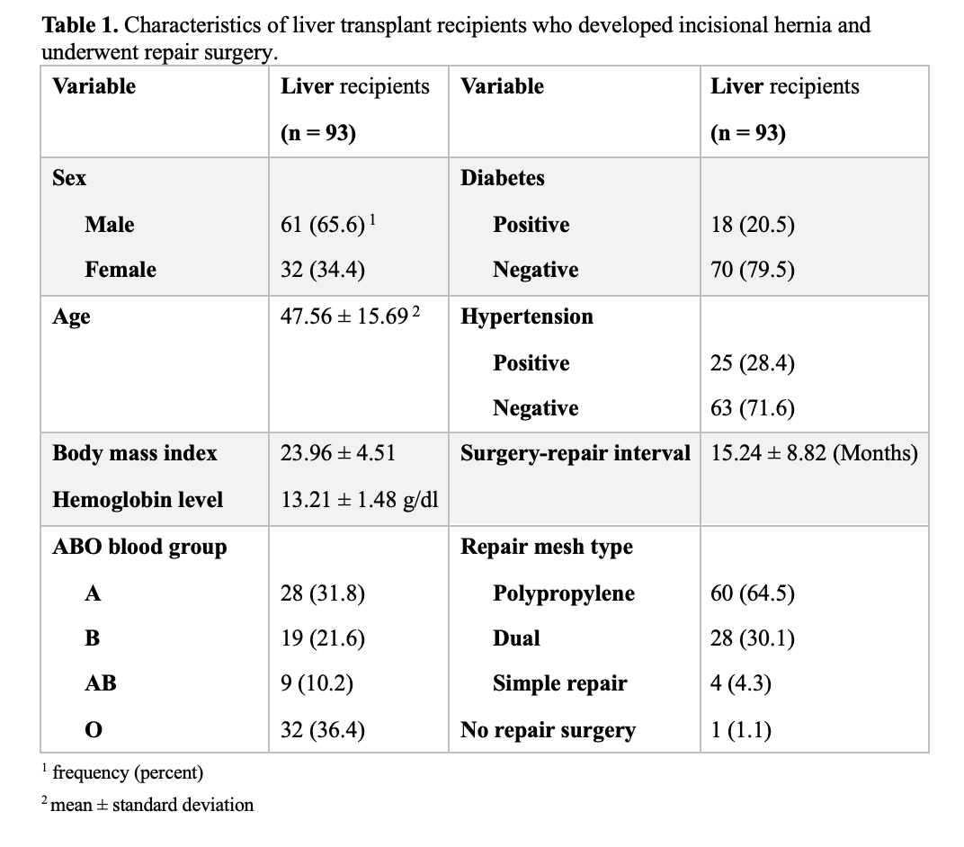 Method: Participants in this retrospective cohort study were liver transplant recipients at Abu-Ali Sina Hospital in Shiraz, Iran. Inclusion criteria involved patients with hernias larger than 2 cm who underwent elective open repair with either polypropylene or dual mesh post liver transplantation. Data collection encompassed demographic and clinical variables, including recurrence, hematoma, and infection rates, monitored for 18 to 36 months. Statistical analysis employed descriptive statistics and multivariable logistic regression to identify factors influencing post-transplant hernia repair complications.