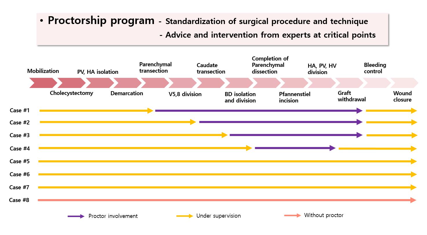 Method: Between August 2022 and October 2023, eight cases of PLDRH were performed for adult-to-adult living donor liver transplantation (LDLT). All operations were performed under the proctorship program and followed Samsung Medical Center’s protocol. The operator was a junior surgeon with some experience in laparoscopic liver resection but had no experience with open donor hepatectomy. In the first four cases, the proctor intervened only at critical points of the surgery, gradually reducing his involvement. In the last four cases, the operator performed the surgery independently.