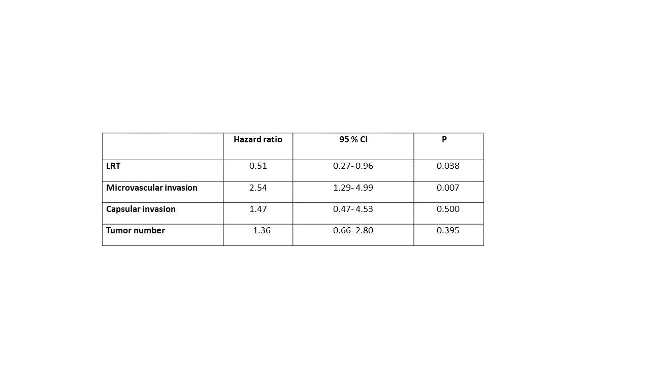 Methods: Liver transplant recipients who had undergone liver transplantation for HCC between 2010 and 2019 were included in the study. Patients’ characteristics including LRT before transplant were recorded. Kaplan-Meier estimation was used for survival analysis with log-rank test and Cox regression analysis was used to assess independent factors for overall survival.